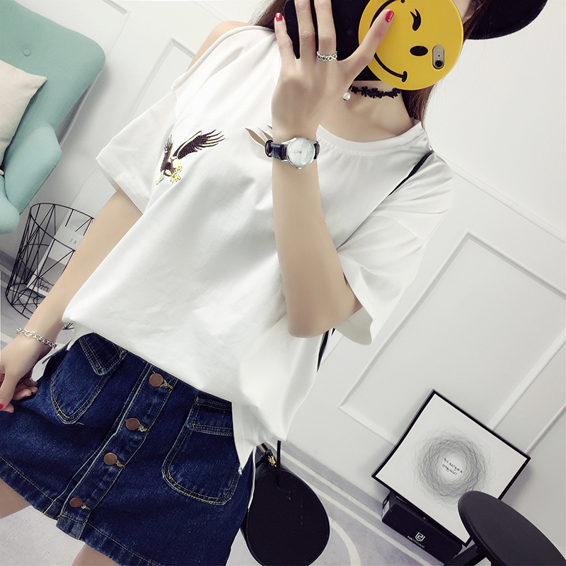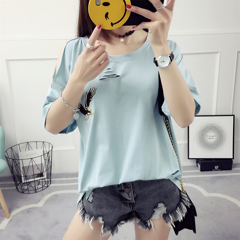 刺繡破洞短袖t恤女夏季春裝新款潮衣服寬松韓版顯瘦露肩上衣