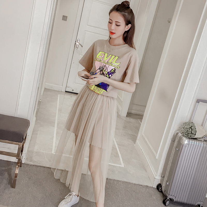 夏季新款女裝韓版網紗兩件套裝裙子中長款修身顯瘦短袖連衣裙
