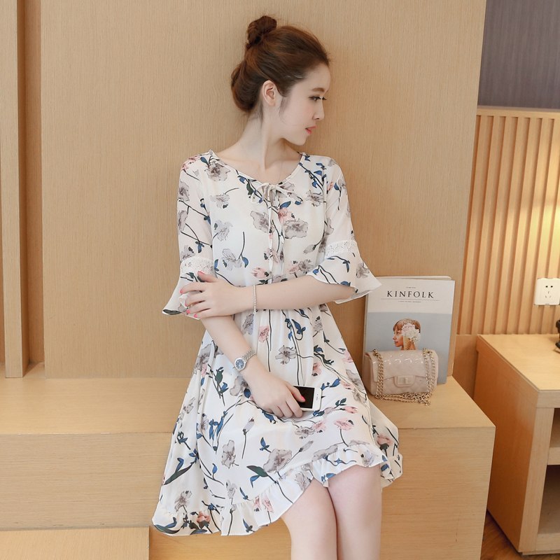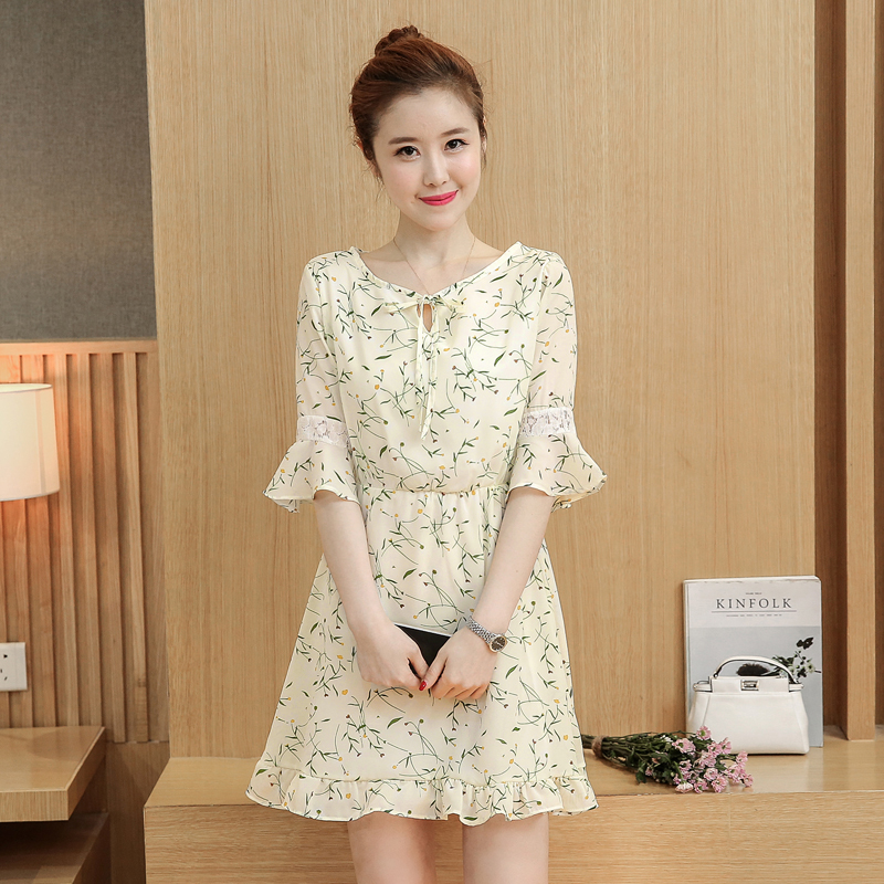 夏裝新款小清新寬松氣質中長款裙子中袖大碼碎花雪紡連衣裙女