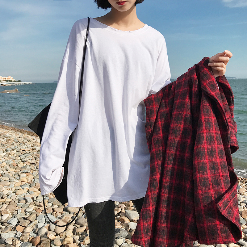 A7seven 破洞寬松oversize白色長袖T恤女春秋韓版百搭圓領打底衫