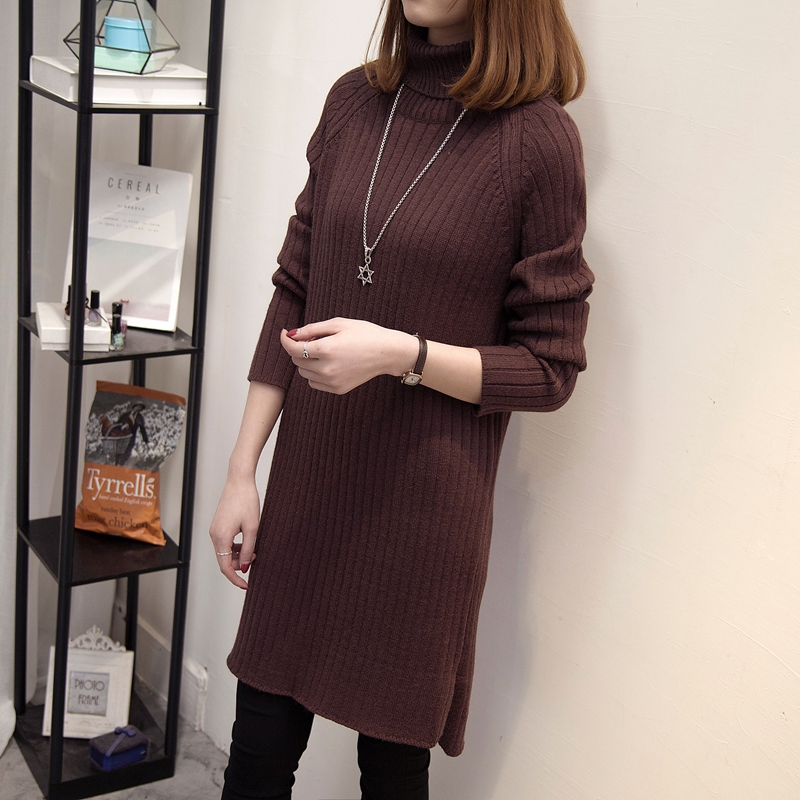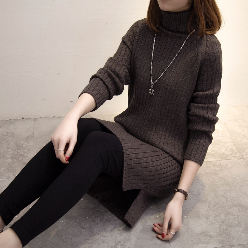 高領針織衫毛衣女秋冬女裝中長款韓版純色套頭外套開叉新款潮
