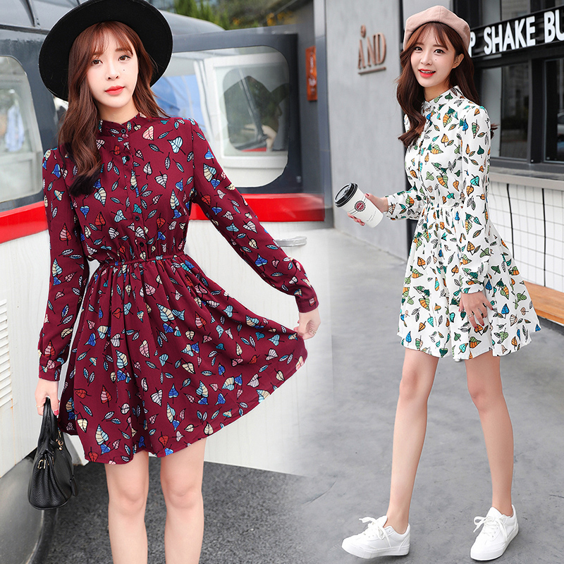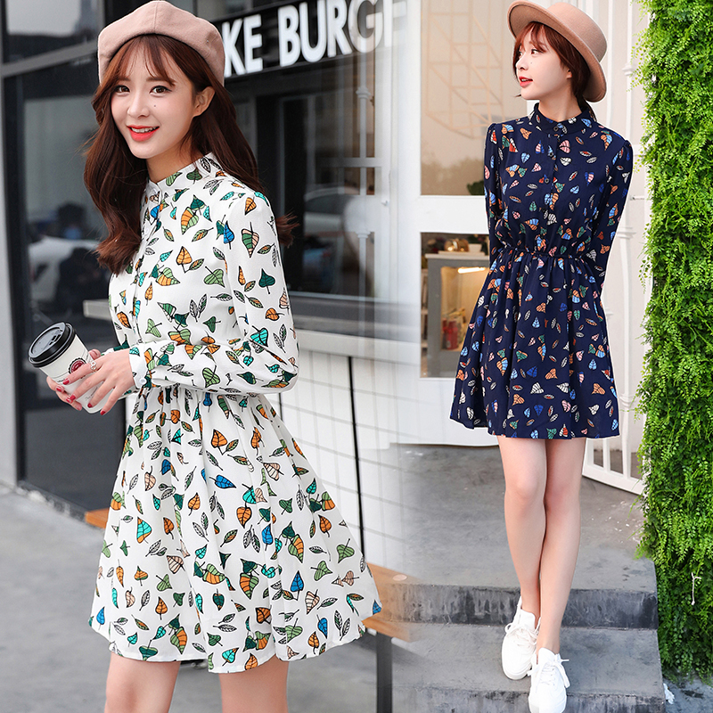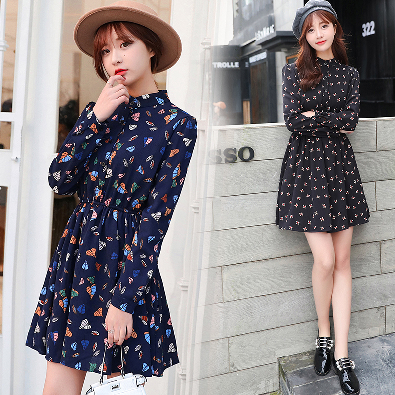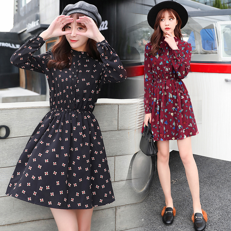 韓版春裝印花長袖連衣裙女雪紡碎花裙子大碼a字裙中長款夏小清新