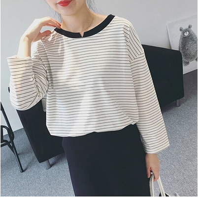 秋裝韓版新款條紋長袖套頭顯瘦百搭時尚T恤上衣打底衫女裝潮