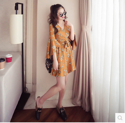 2017夏季新款女喇叭袖V領印花雪紡連衣裙荷葉邊高腰系帶收腰短裙