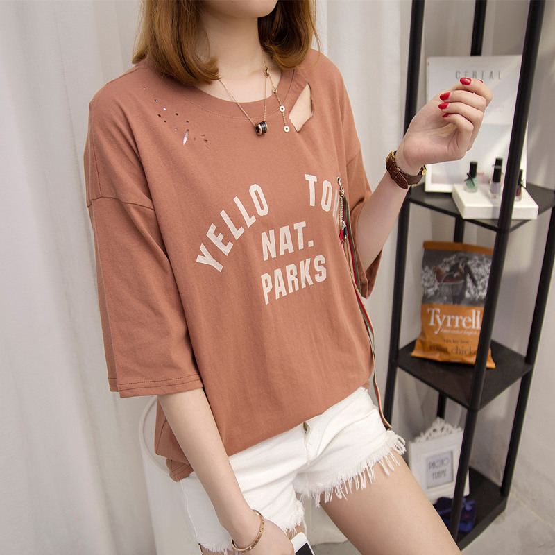 短袖上衣女夏新款破洞鏤空白色t恤女中長袖寬松韓版打底百搭