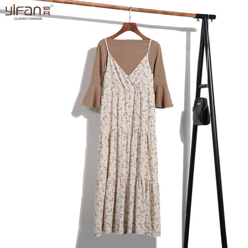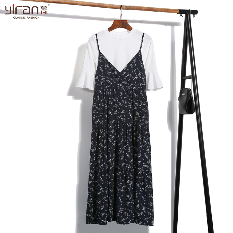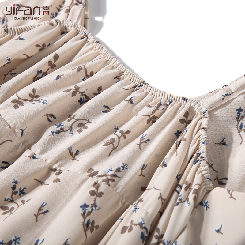 新款復古雪紡連衣裙女荷葉邊V領中長款顯瘦百褶裙碎花吊帶裙夏季