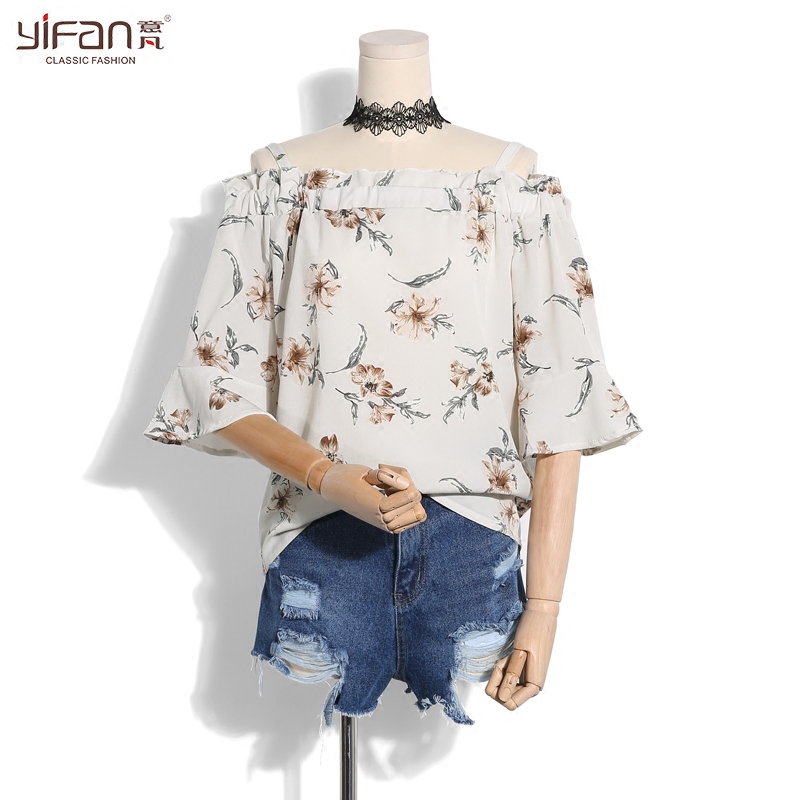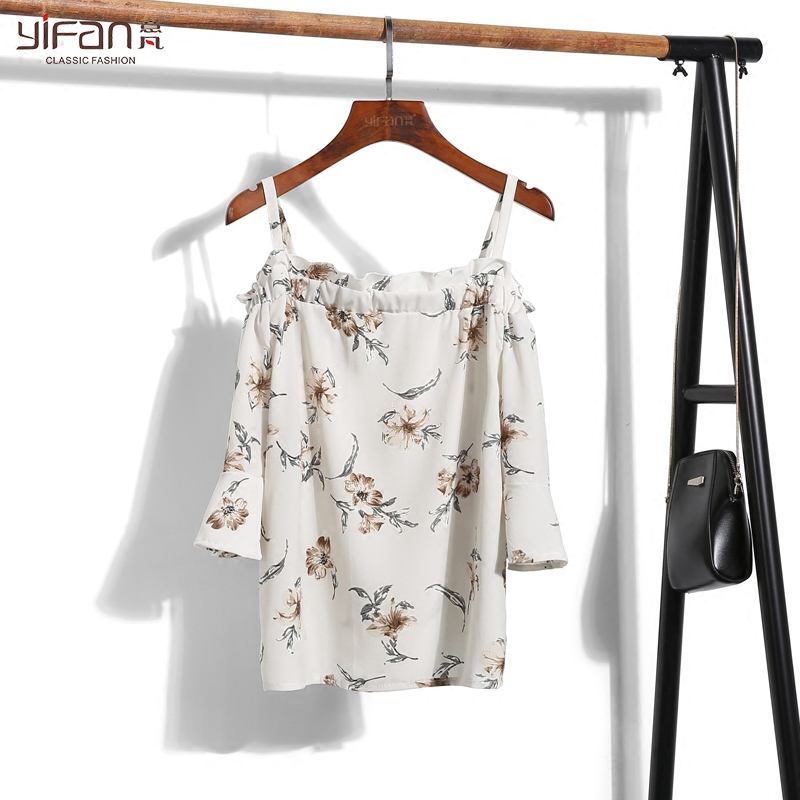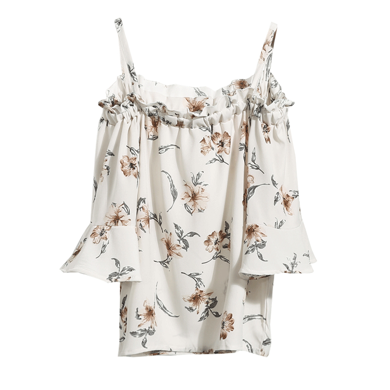 夏季甜美荷葉邊喇叭袖一字領露肩碎花雪紡衫露肩吊帶上衣女七分袖