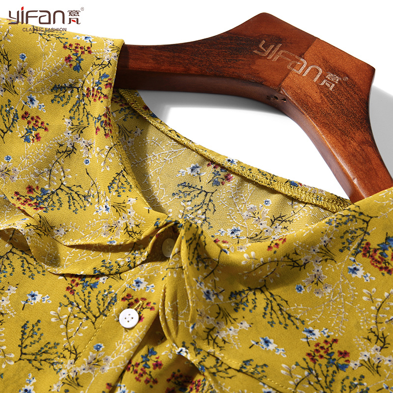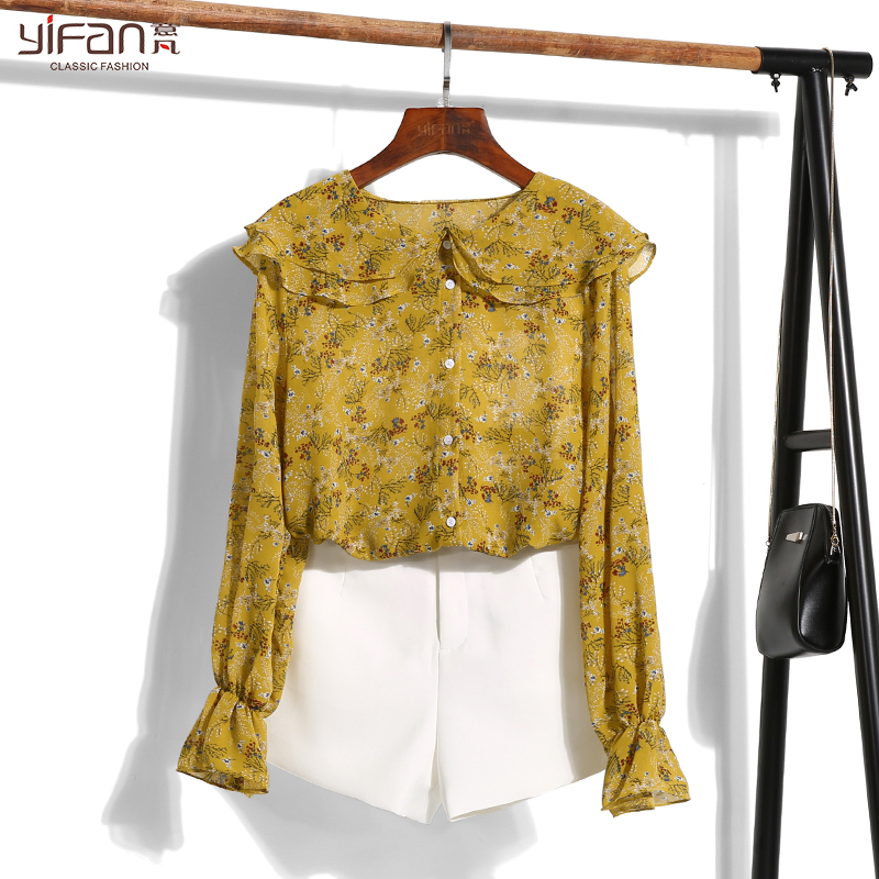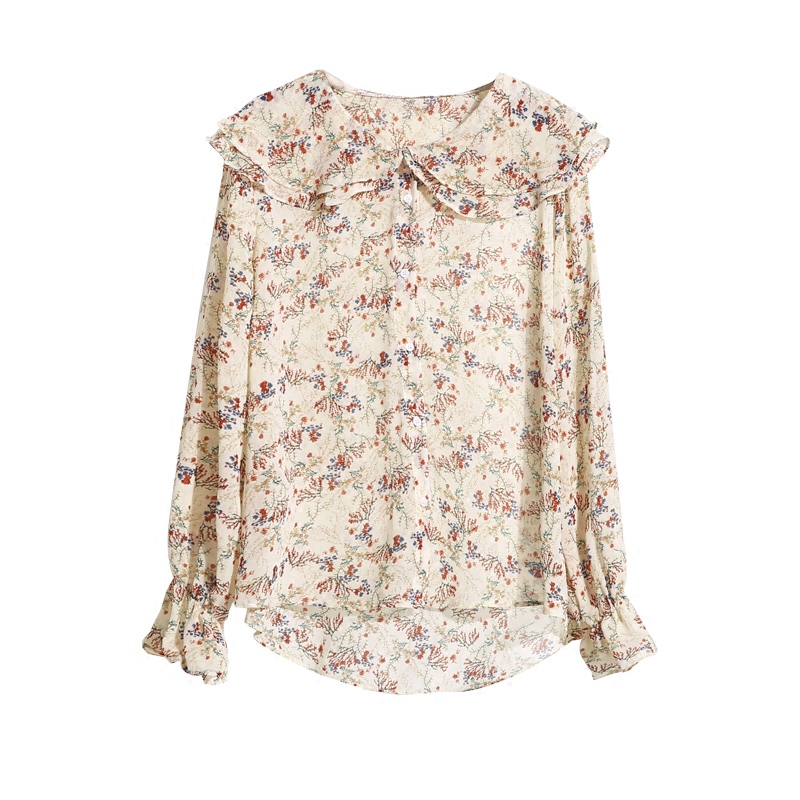 春夏韓國甜美小清新碎花荷葉邊娃娃領長袖雪紡襯衫女印花雪紡上衣