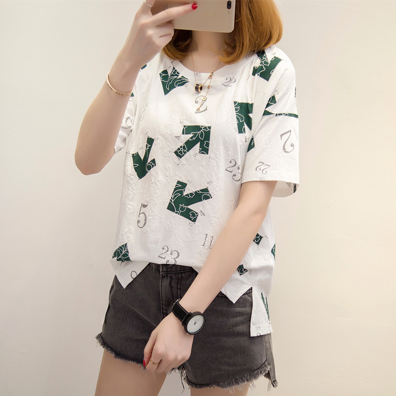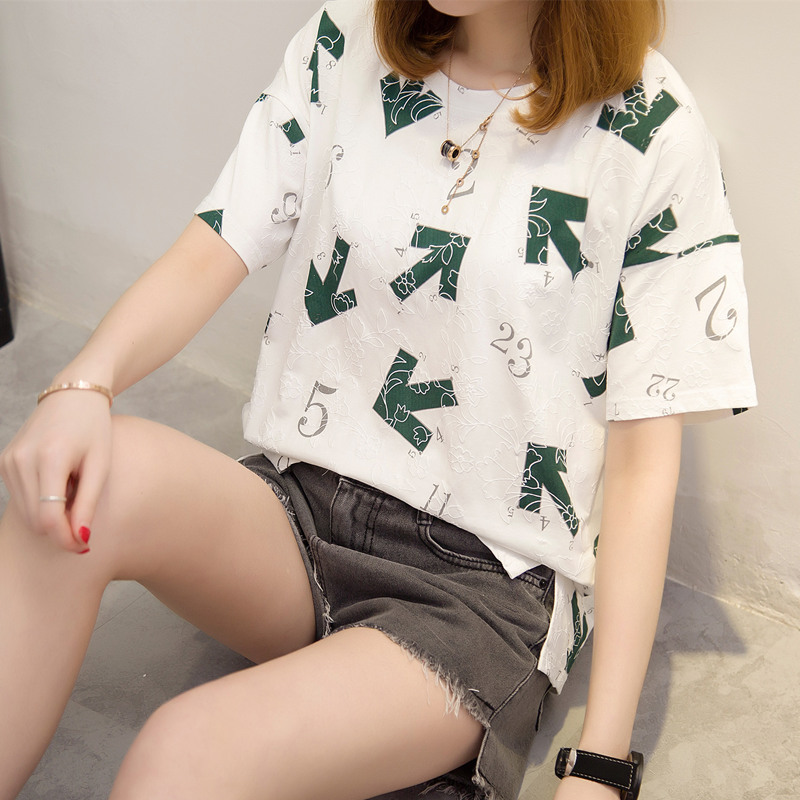 夏裝新款女裝寬松刺繡白色t恤女個性休閑打底百搭韓版體恤衫