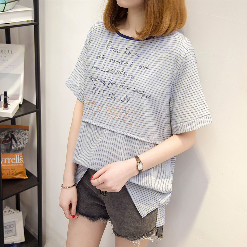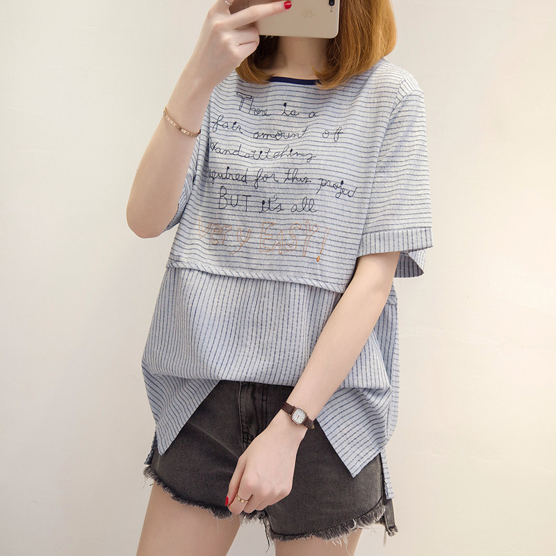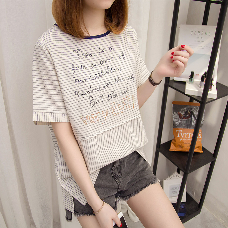 夏裝新款女裝條紋t恤女上衣韓版寬松拼接短袖體恤衫字母百搭