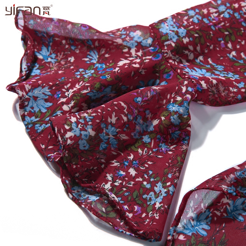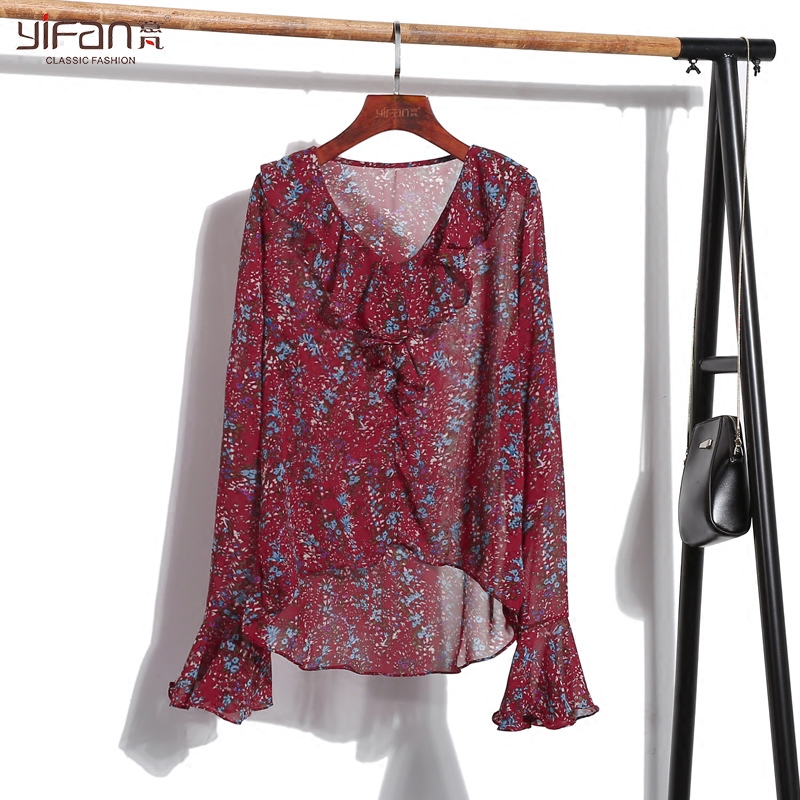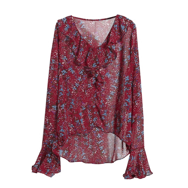 春夏裝新款韓國氣質荷葉邊V領喇叭袖碎花雪紡衫女長袖上衣薄