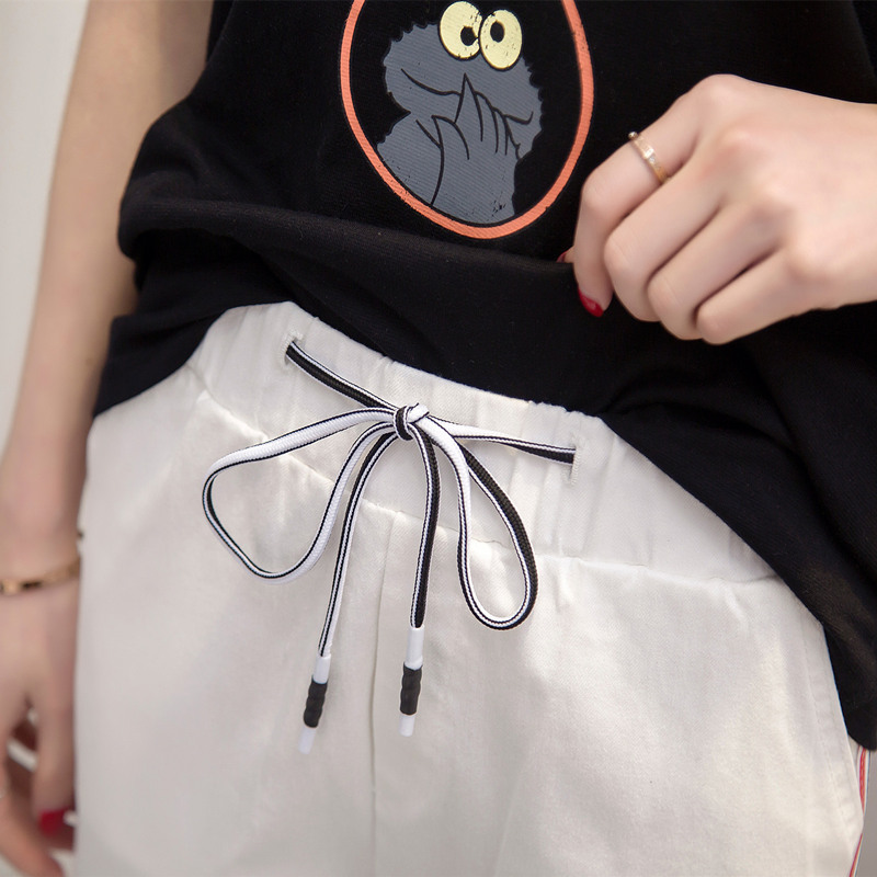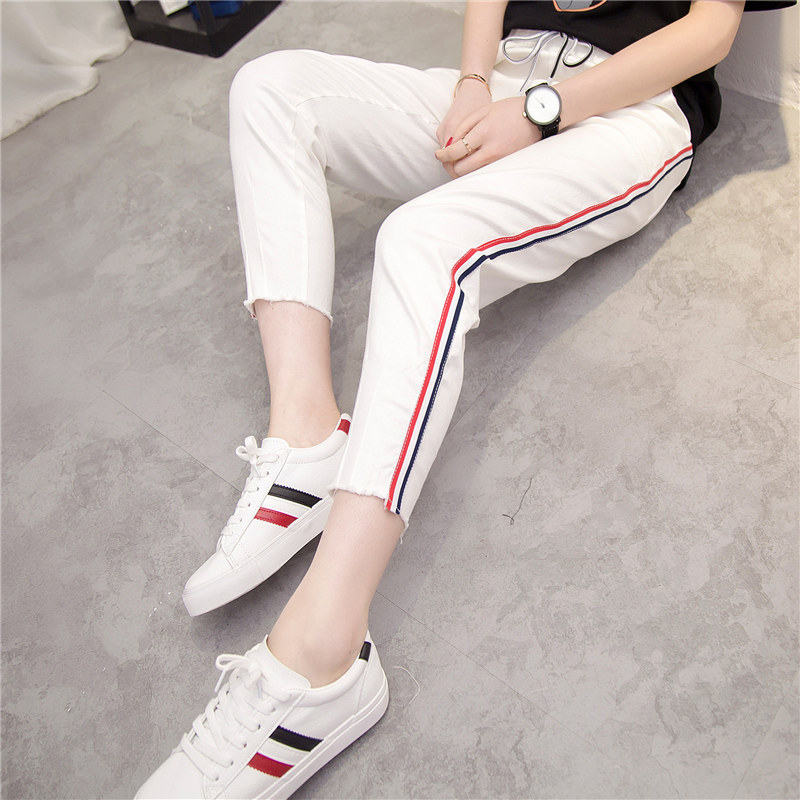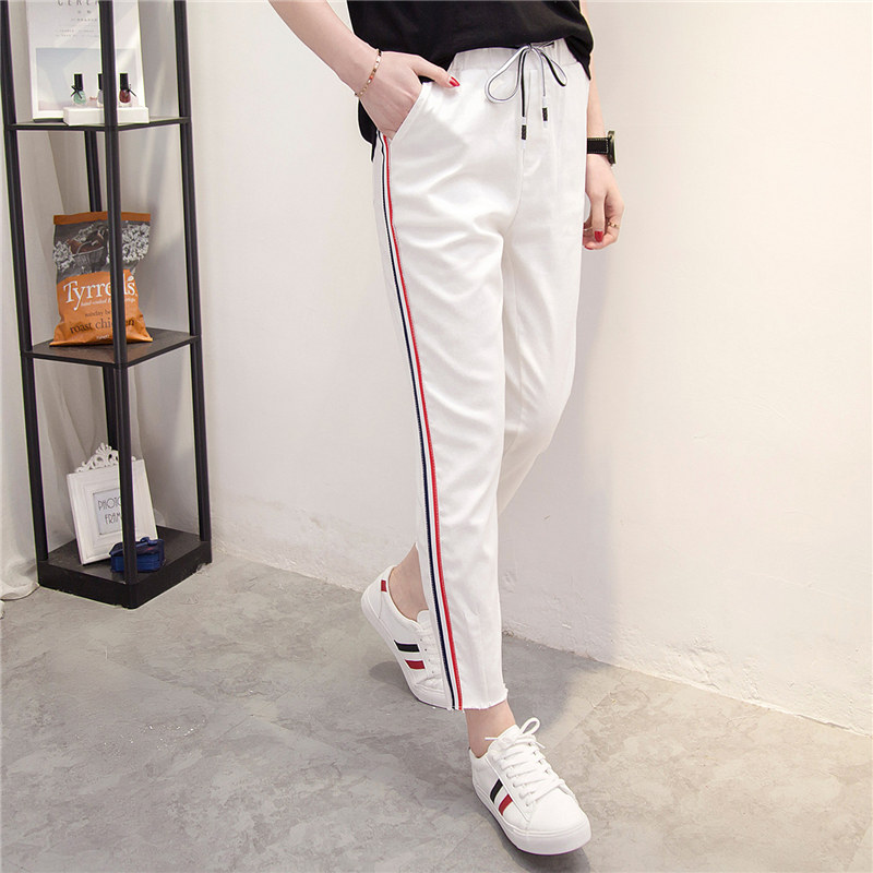 休閑褲女裝夏裝時尚新款白色九分褲寬松顯瘦條紋低腰小腳褲潮