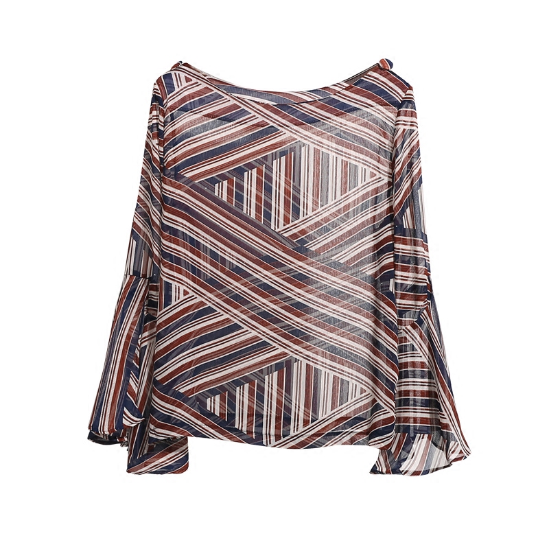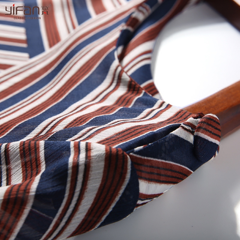 韓版春夏新款上衣夏雪紡衫女七分喇叭中袖荷葉邊印花條紋寬松