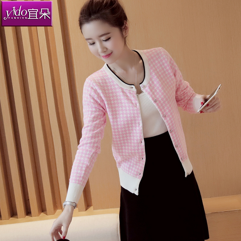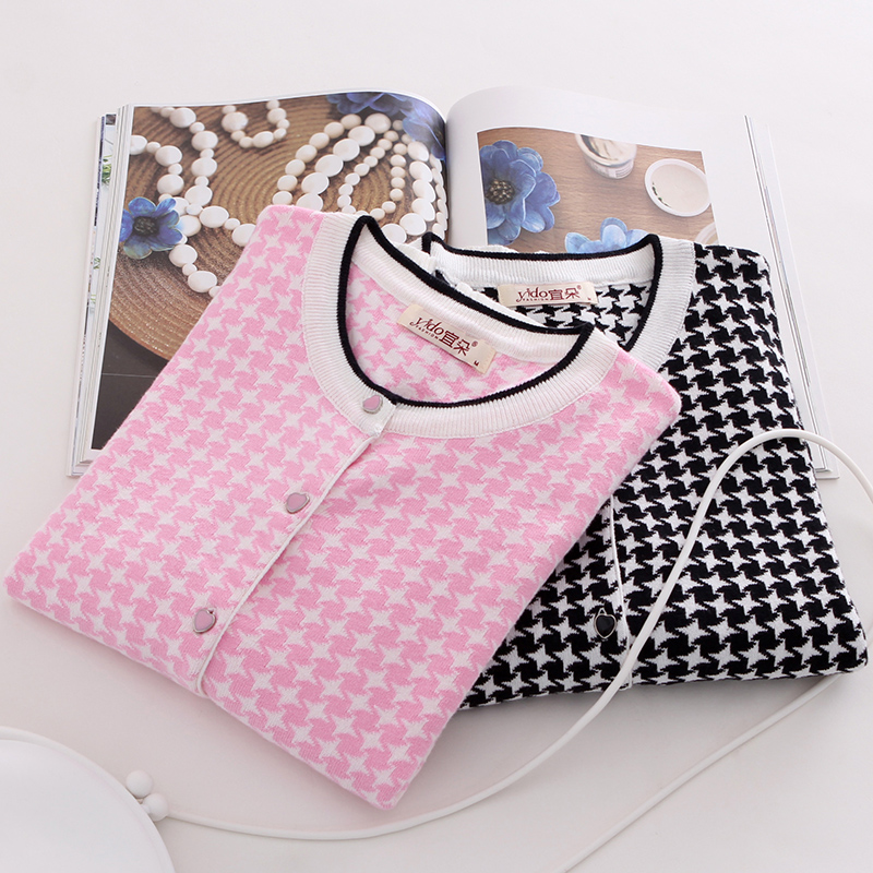 春季新款長袖針織衫女開衫春秋常規毛衣外套女千鳥格針織開衫