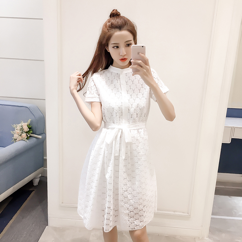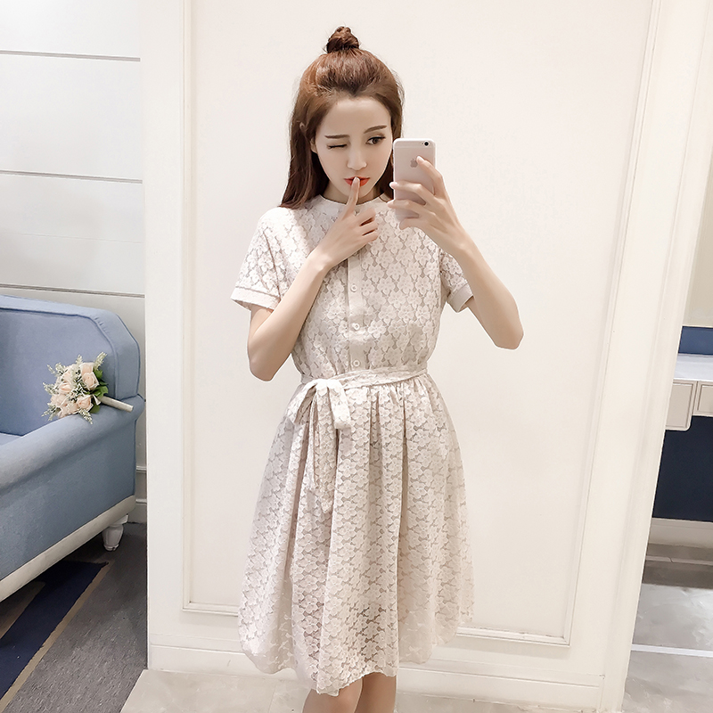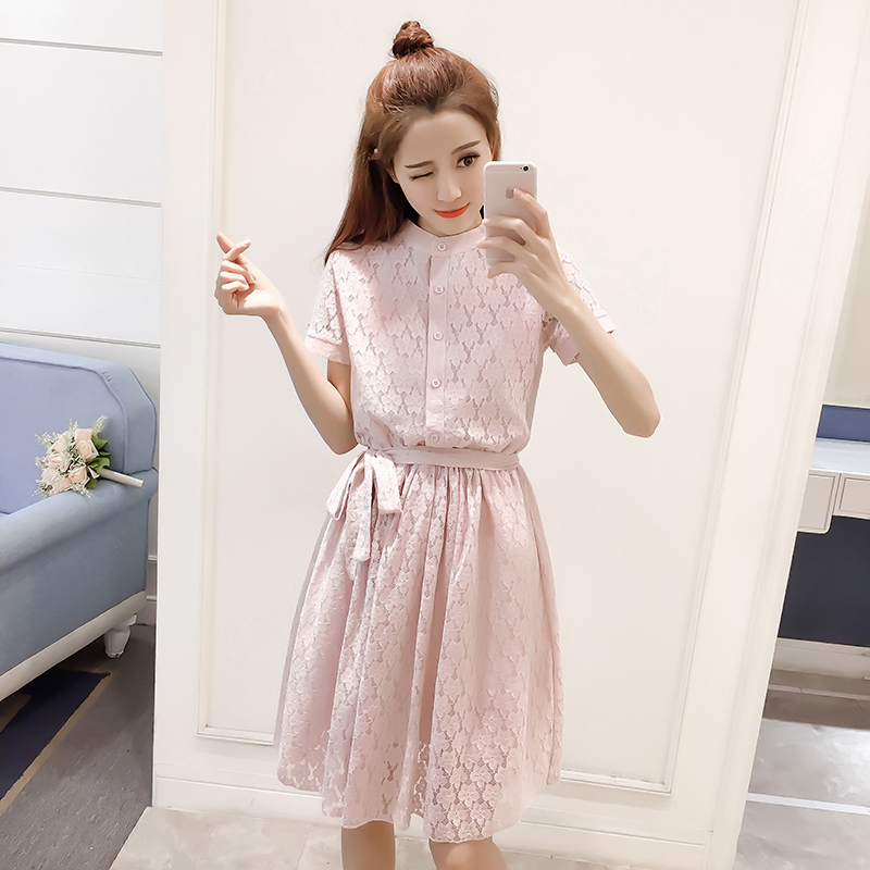 新款女裝韓版中長款收腰a字裙子修身短袖蕾絲襯衫連衣裙女夏