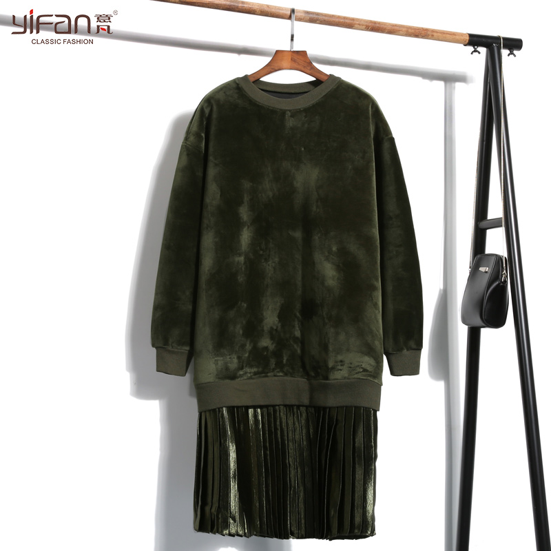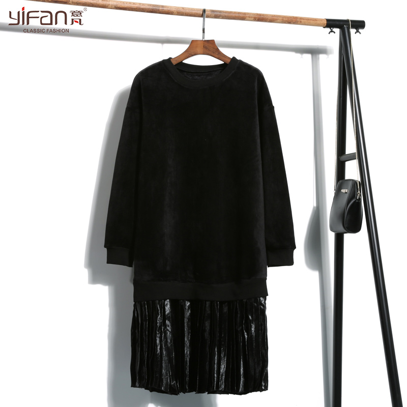 韓版套頭拼接百褶連衣裙雙面絨加厚金絲絨假兩件衛衣裙長袖打底裙