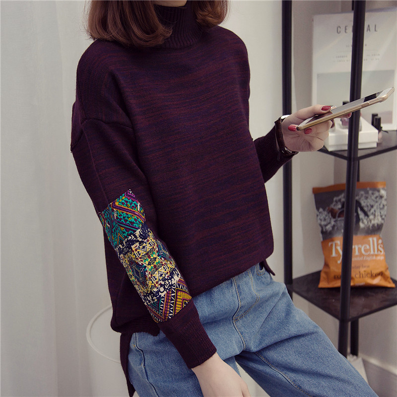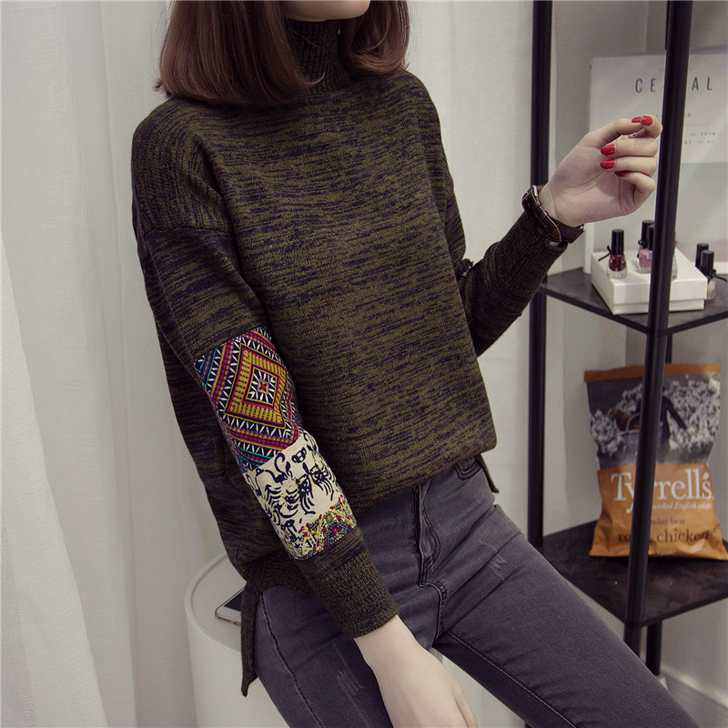 拼色名族風針織衫女套頭打底衫半高領長袖寬松毛衣女秋冬季女裝潮
