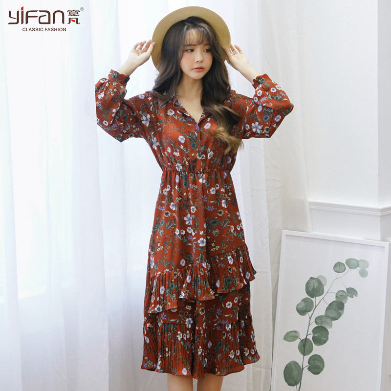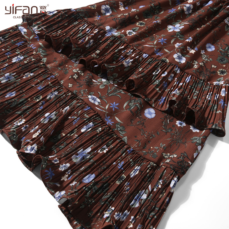 春夏雪紡波浪拼接長款連衣裙女裝碎花寬松長袖打底沙灘裙