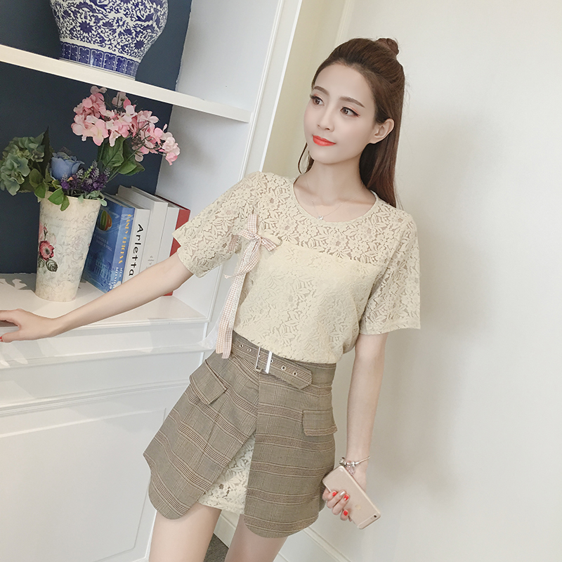 夏季新款韓版小香風蕾絲衫兩件套女休閑格子半身短裙時尚套裝