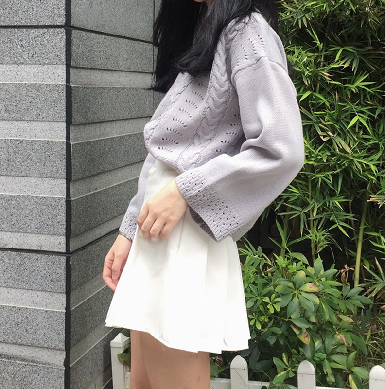 韓國鏤空短款寬松套頭毛衣上衣復古學生秋裝百搭長袖針織衫女