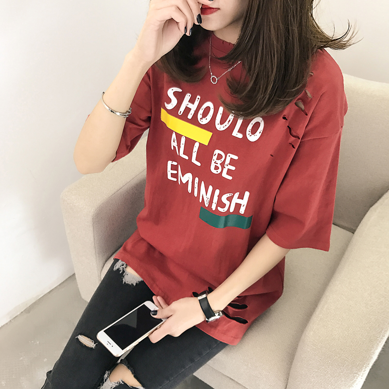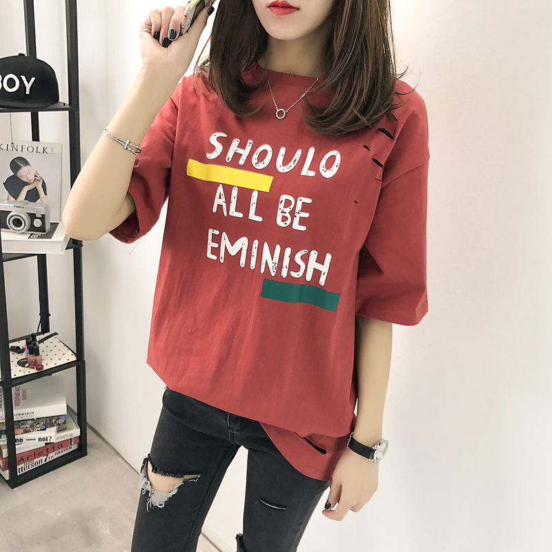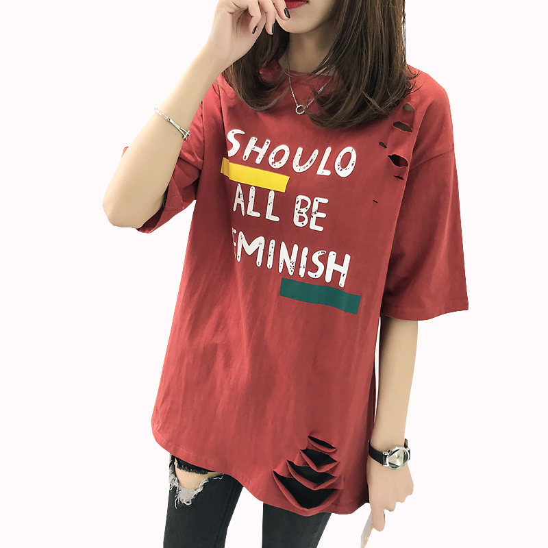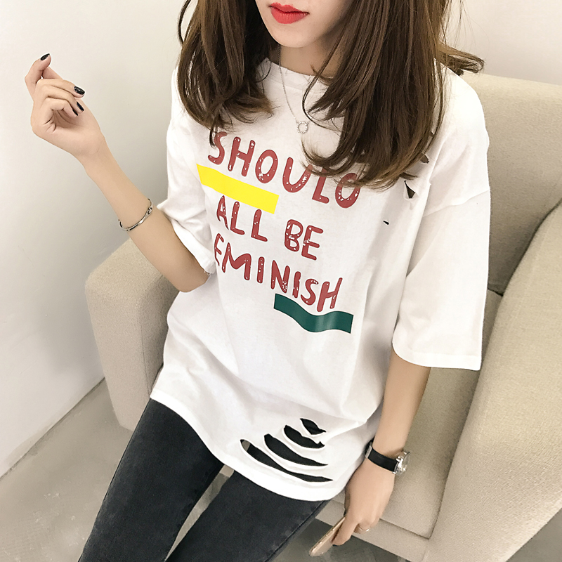 春裝新款韓版學生印花破洞短袖T恤女夏季寬松中長款打底上衣