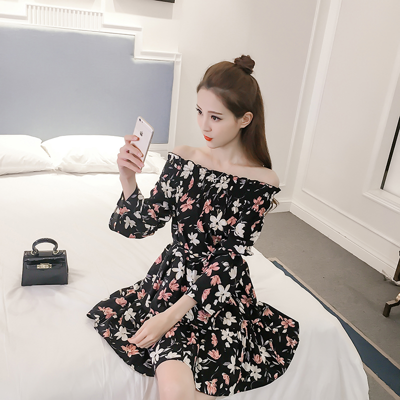 春裝新款女裝復古印花一字領打底裙修身收腰碎花雪紡連衣裙潮