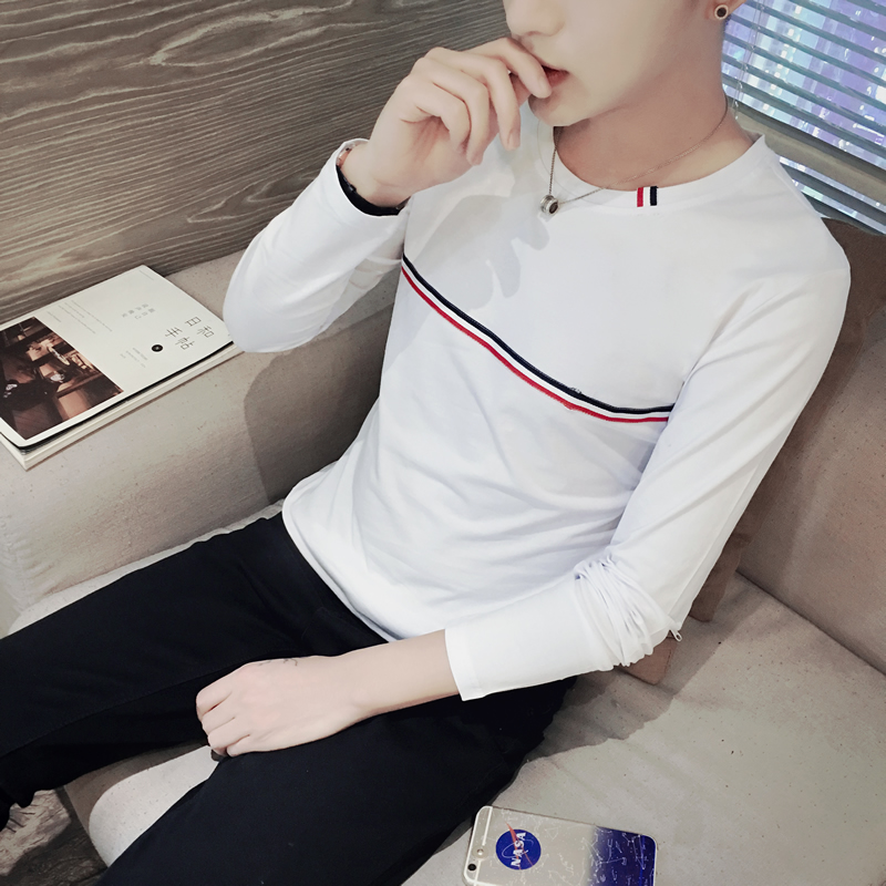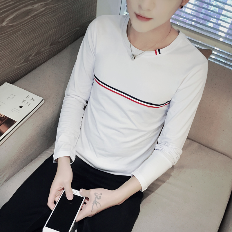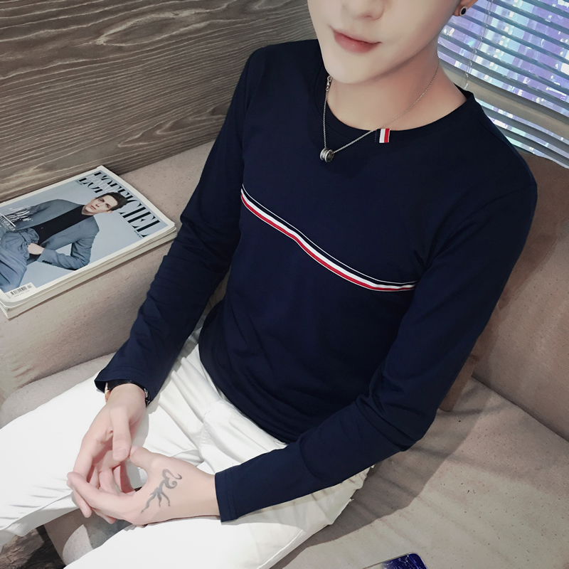 青年春季男士長袖t恤圓領修身大碼印花打底衫上衣服男