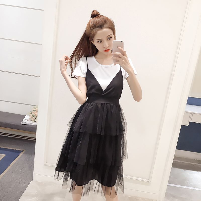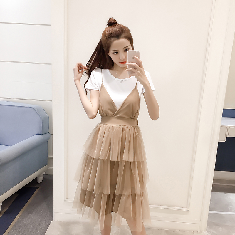 夏季新款女裝韓版網紗吊帶裙兩件套中長款顯瘦短袖蓬蓬連衣裙