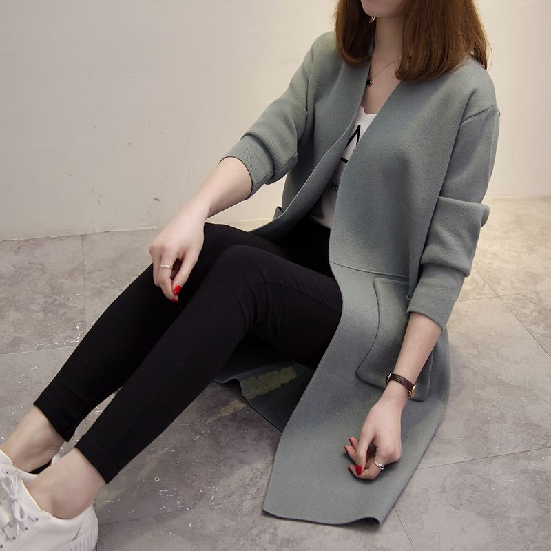 中長款寬松針織衫開衫韓版秋冬季新款女裝純色口袋毛衣外套女潮
