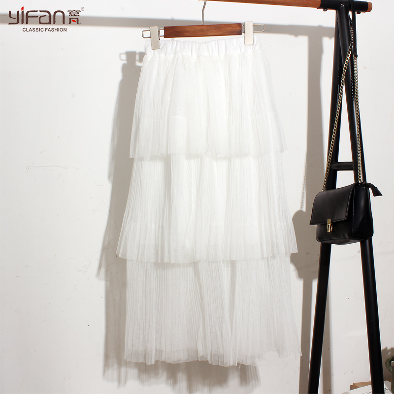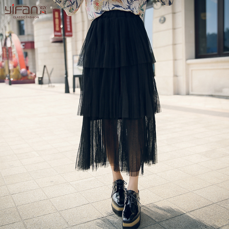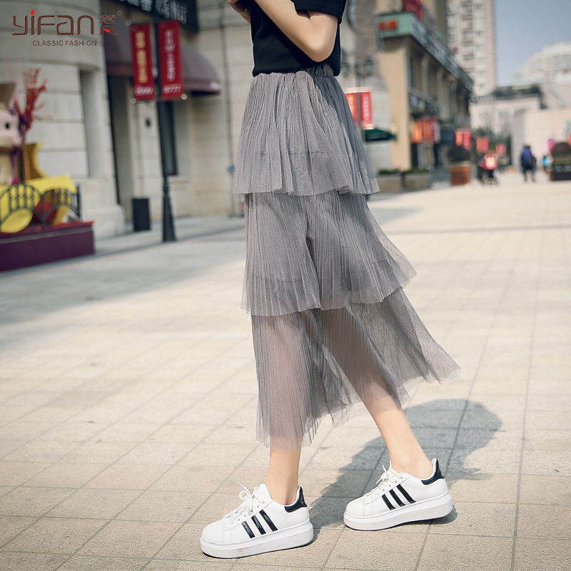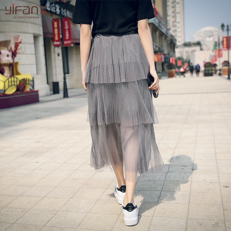 韓版夏裝新款紗網百褶鏤空百搭半身裙女裝大擺高腰中裙