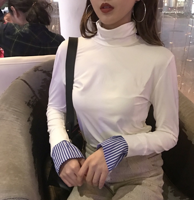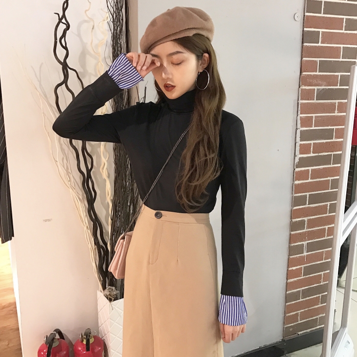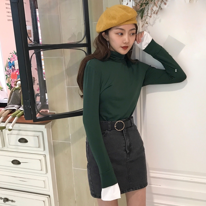 韓國chic秋冬款彈力修身高領套頭假兩件百搭長袖打底衫T恤女