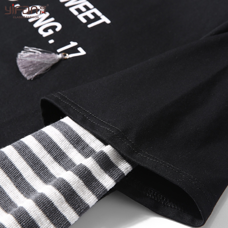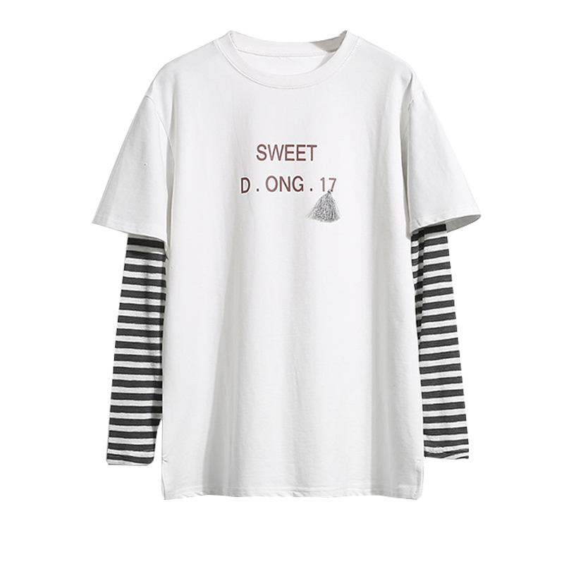 春秋寬松條紋長袖拼接休閑T恤韓版圓領套頭假兩件上衣女裝