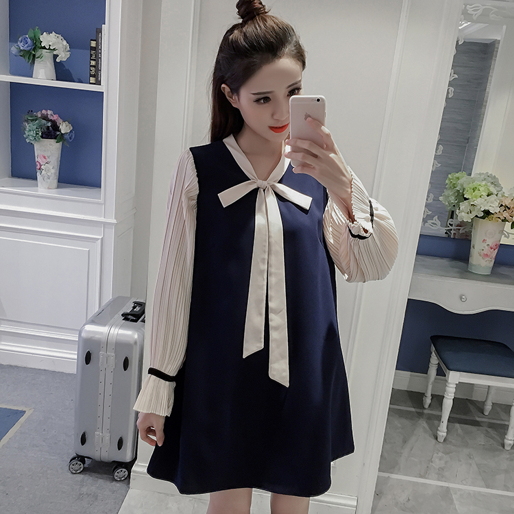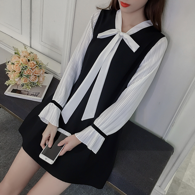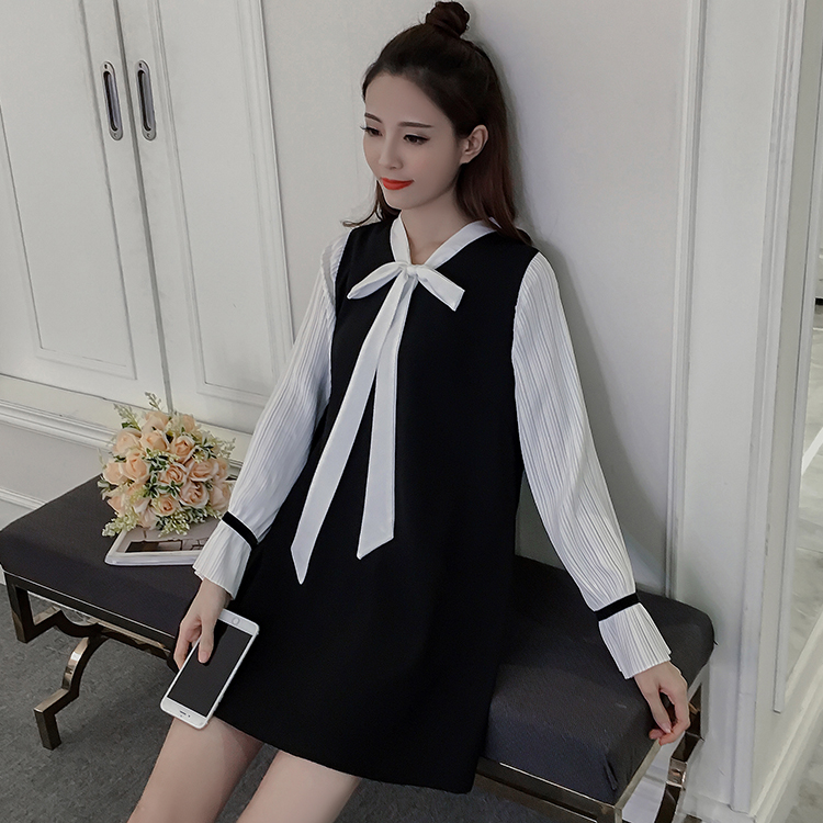 春裝新款女裝學院風拼接打底裙秋冬大碼顯瘦長袖雪紡連衣裙子