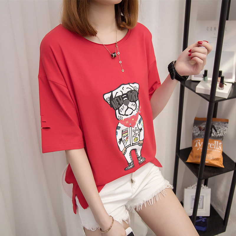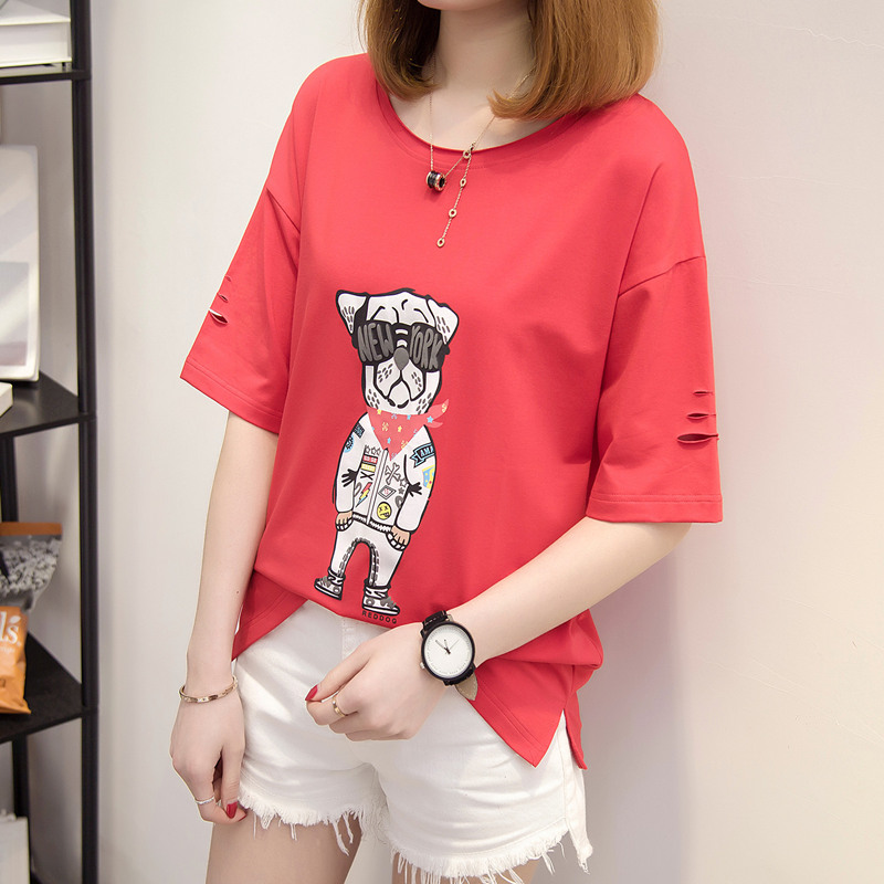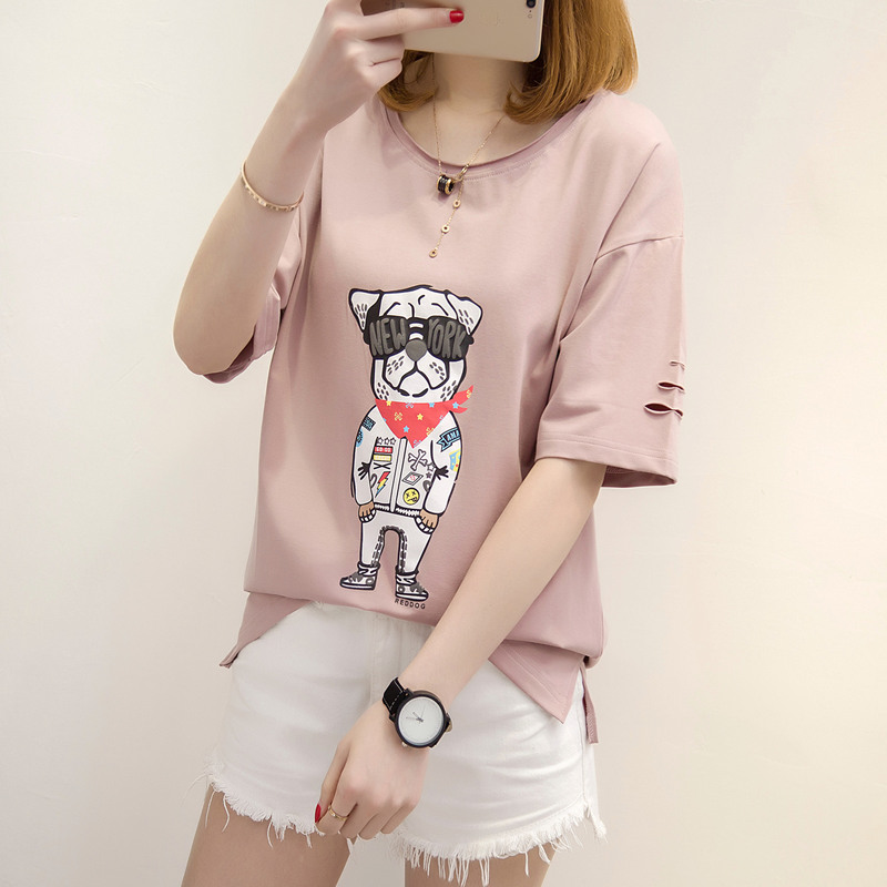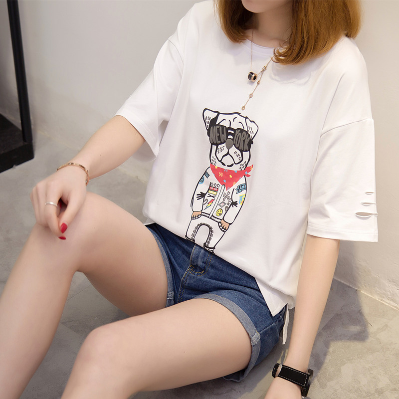 上衣女夏裝新款女裝白色t恤女寬松破洞短袖休閑時尚韓版百搭
