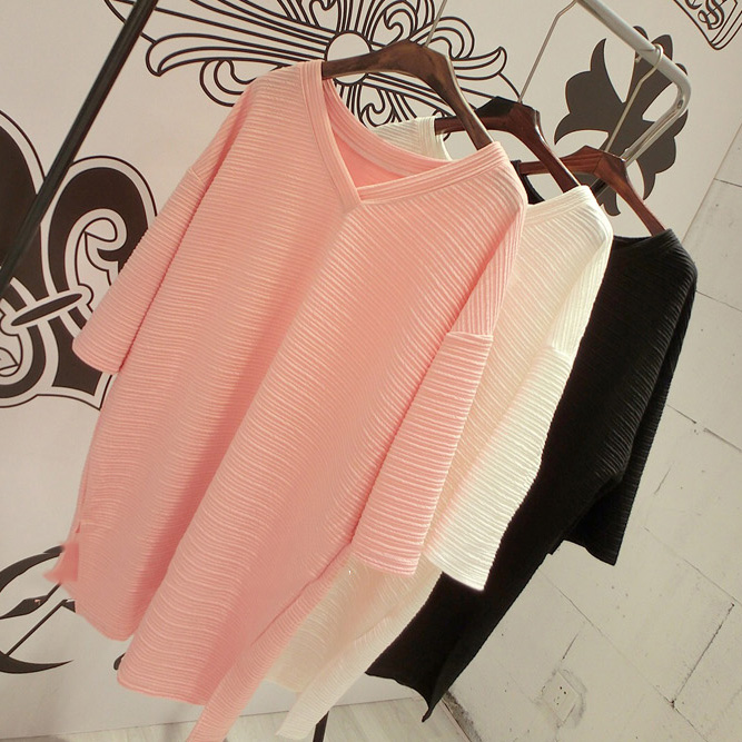 春裝女裝新款韓版V領顯瘦七分袖打底衫上衣中長款寬松套頭T恤
