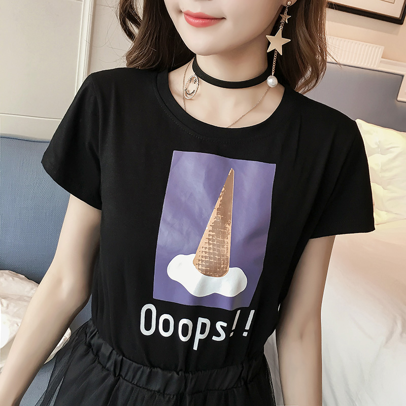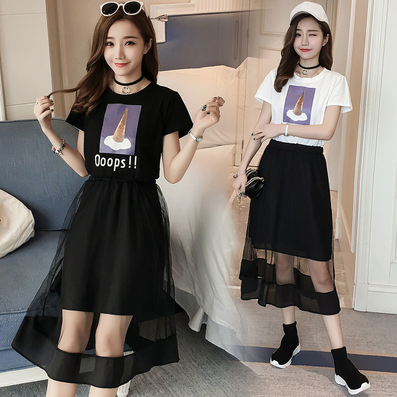 夏季新款女裝韓版印花短袖中長款網紗拼接修身顯瘦T恤連衣裙