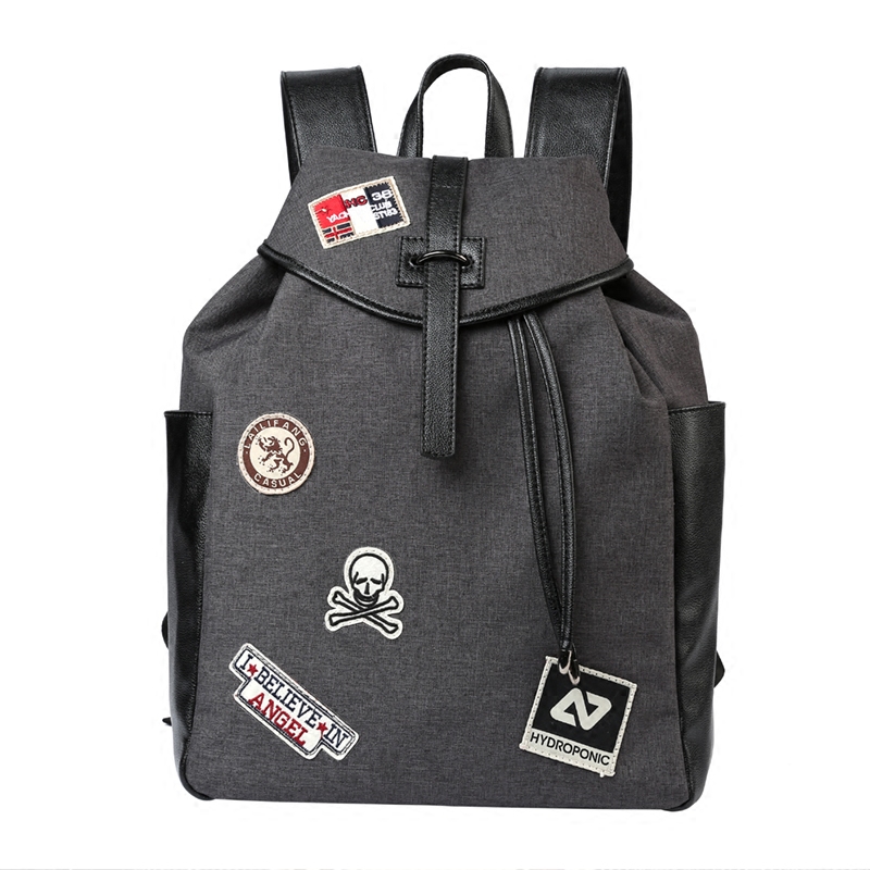 原創新款灰色男女雙肩背包潮流帆布學生書包徽章包蓋抽繩雙肩包