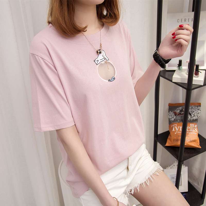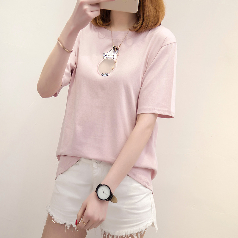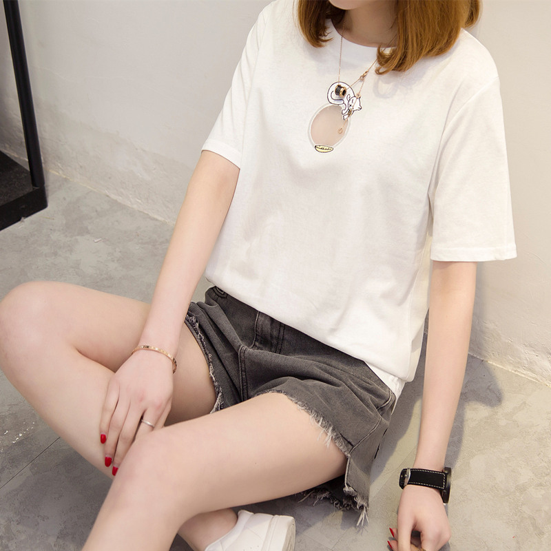 女裝夏裝新款潮上衣女夏短袖t恤女鏤空簡約時尚寬松體恤衫
