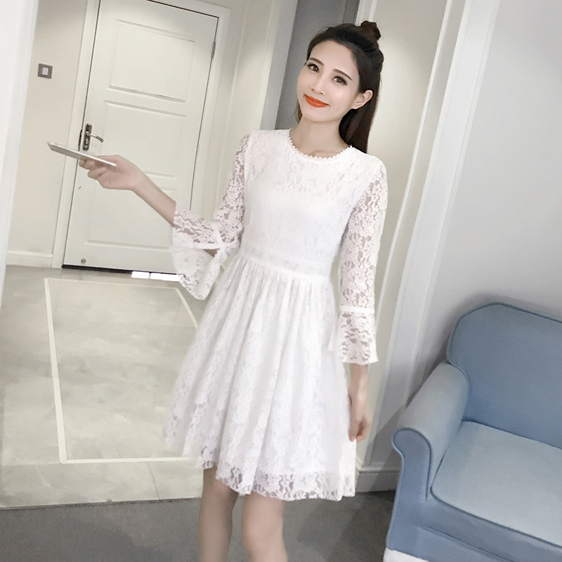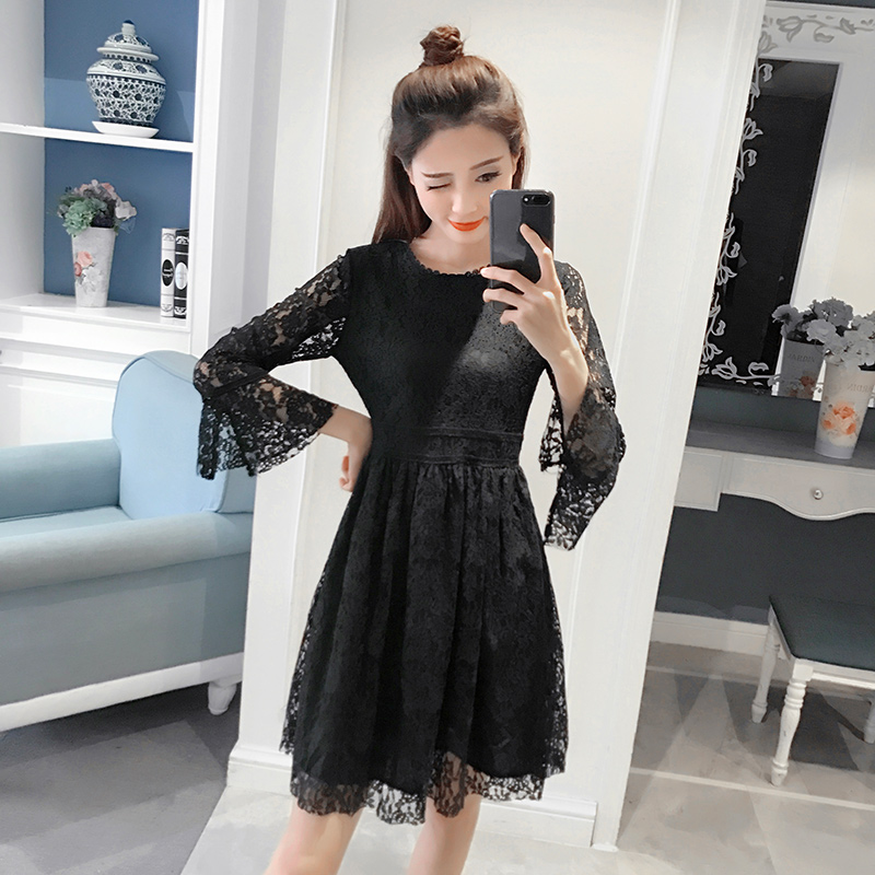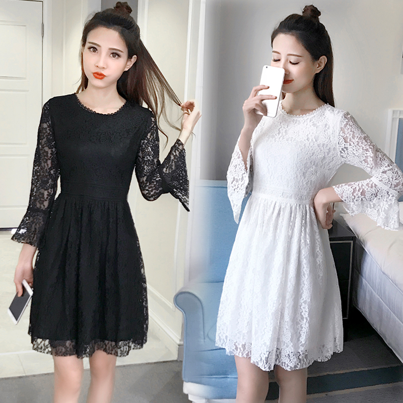 春裝新款女裝韓版喇叭袖打底裙女修身高腰長袖蕾絲連衣裙秋冬