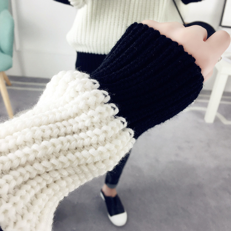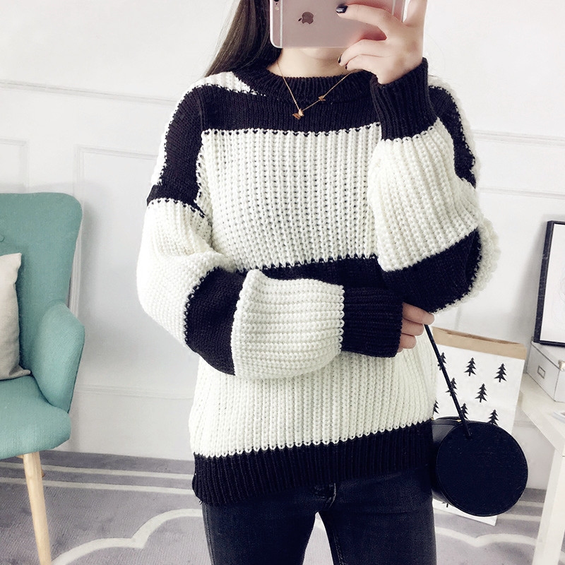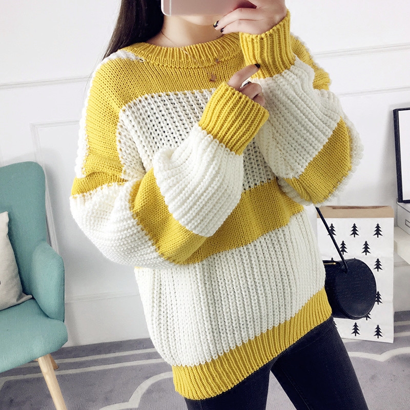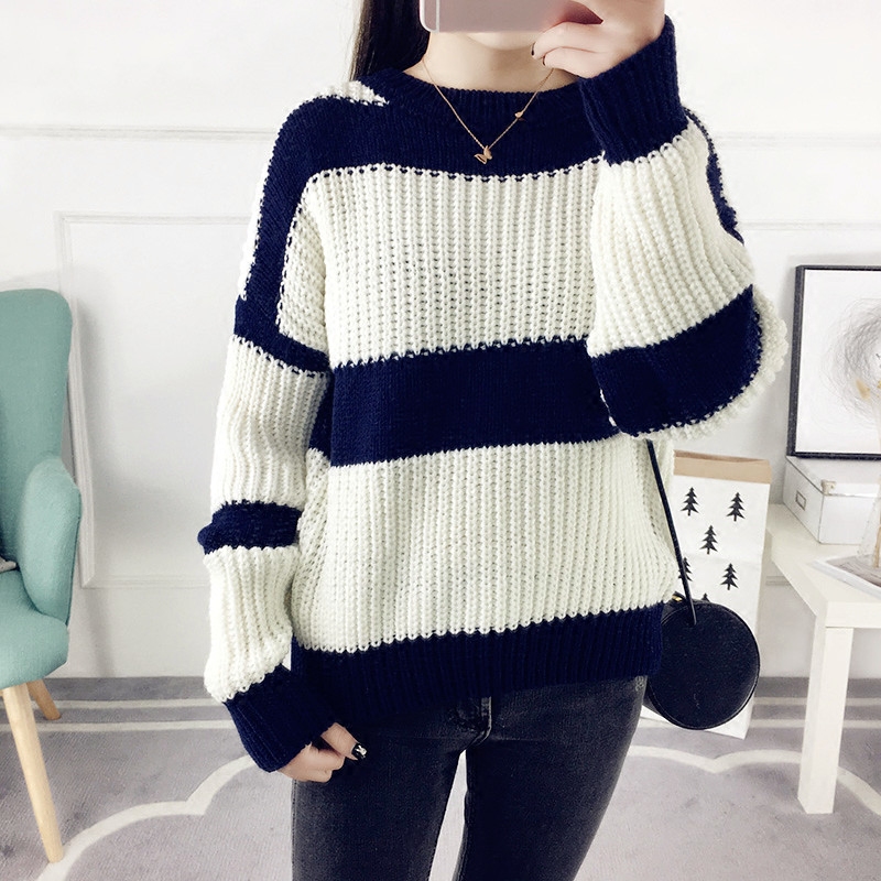 秋冬套頭毛衣女寬松韓版粗毛線衣條紋針織衫長袖女裝新款打底衫潮