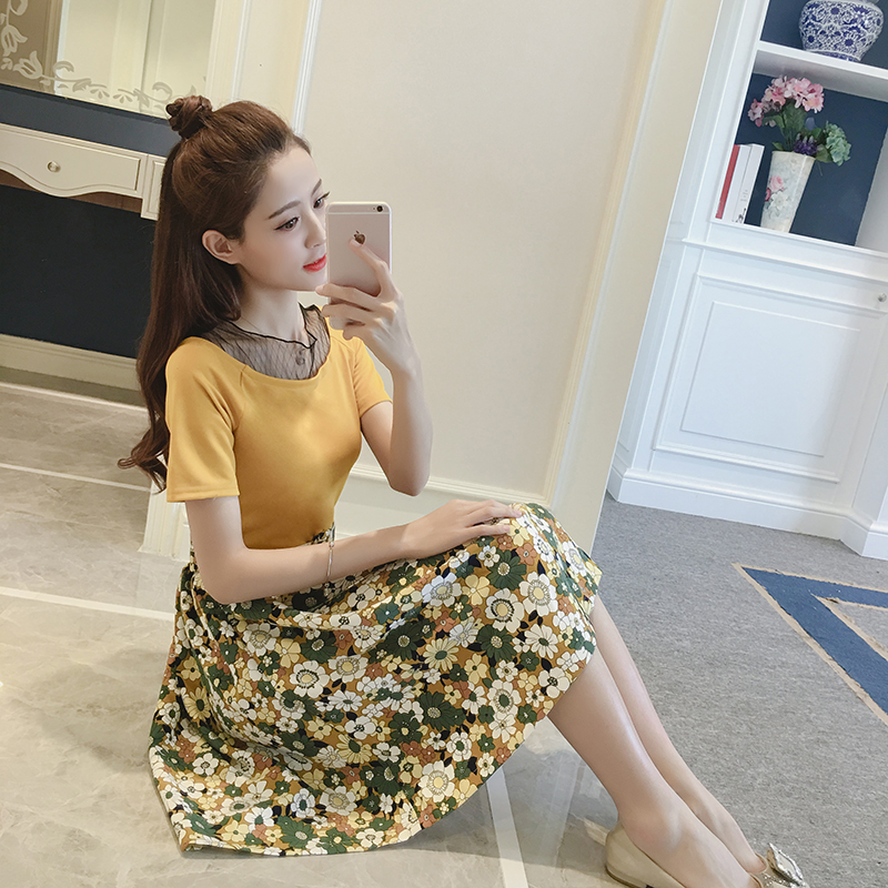 夏季新款女裝韓版網紗拼接印花中長款修身假兩件短袖連衣裙子