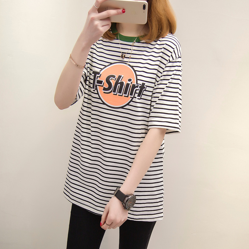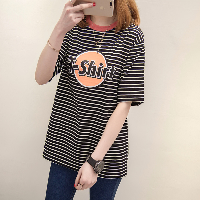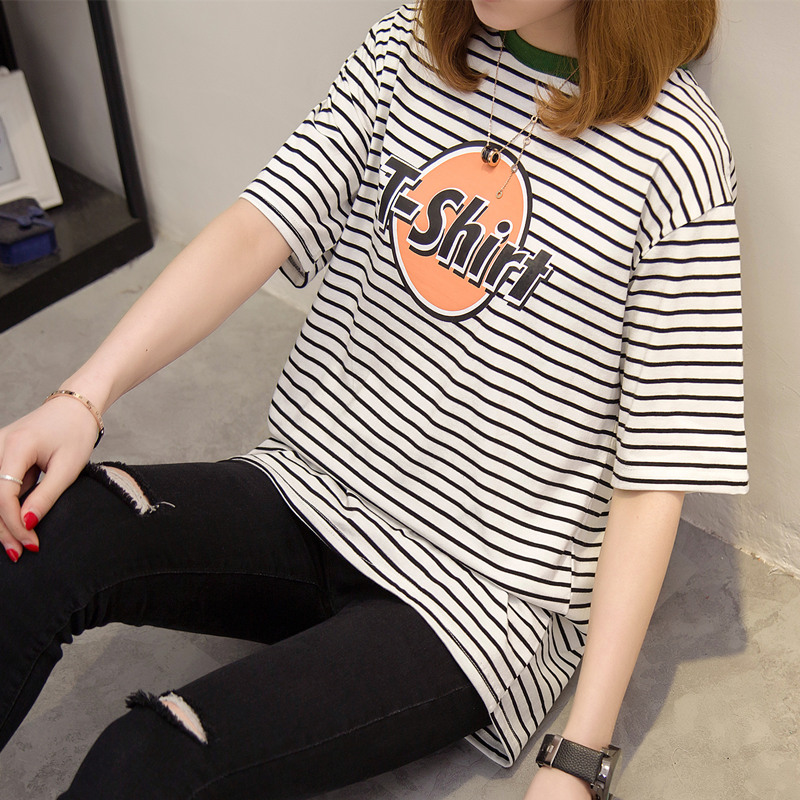 條紋短袖t恤女字母印花新款韓版寬松中長款體恤衫夏裝新款女