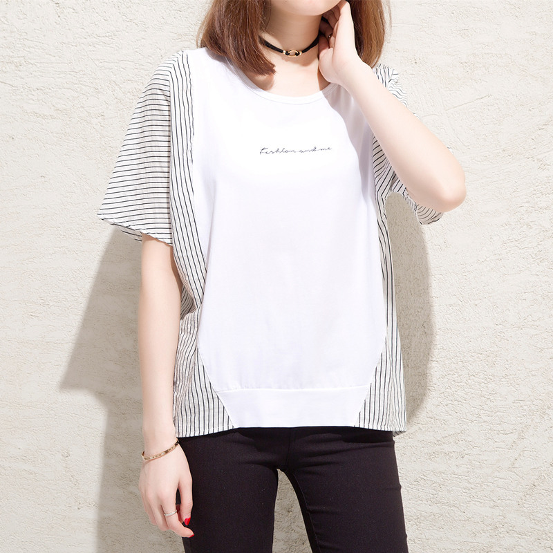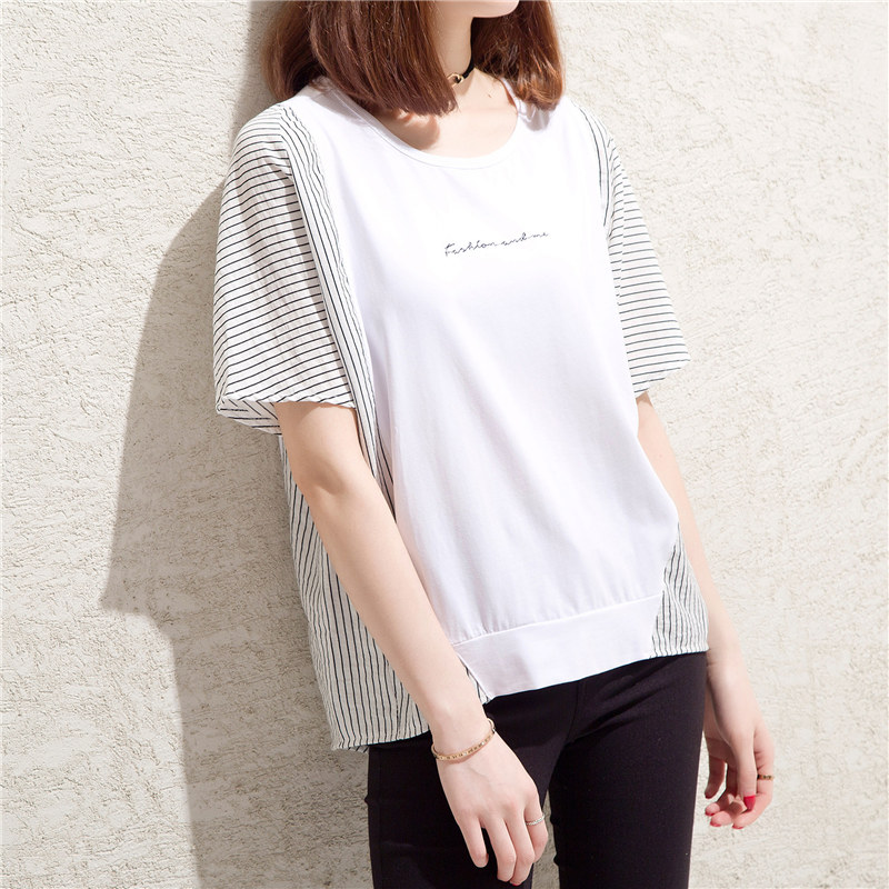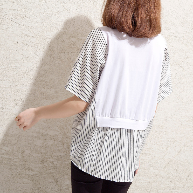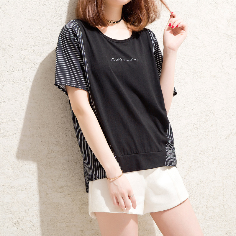 條紋t恤女小心機上衣大碼拼接寬松bf風體恤衫短袖女夏裝新款