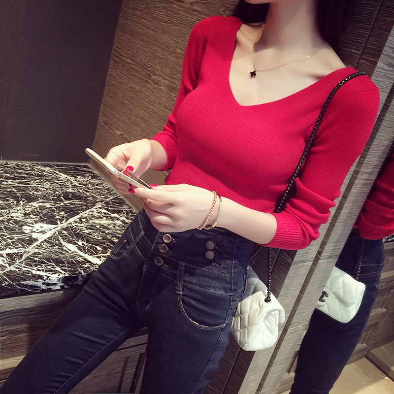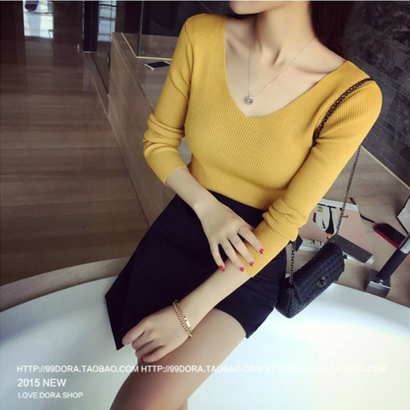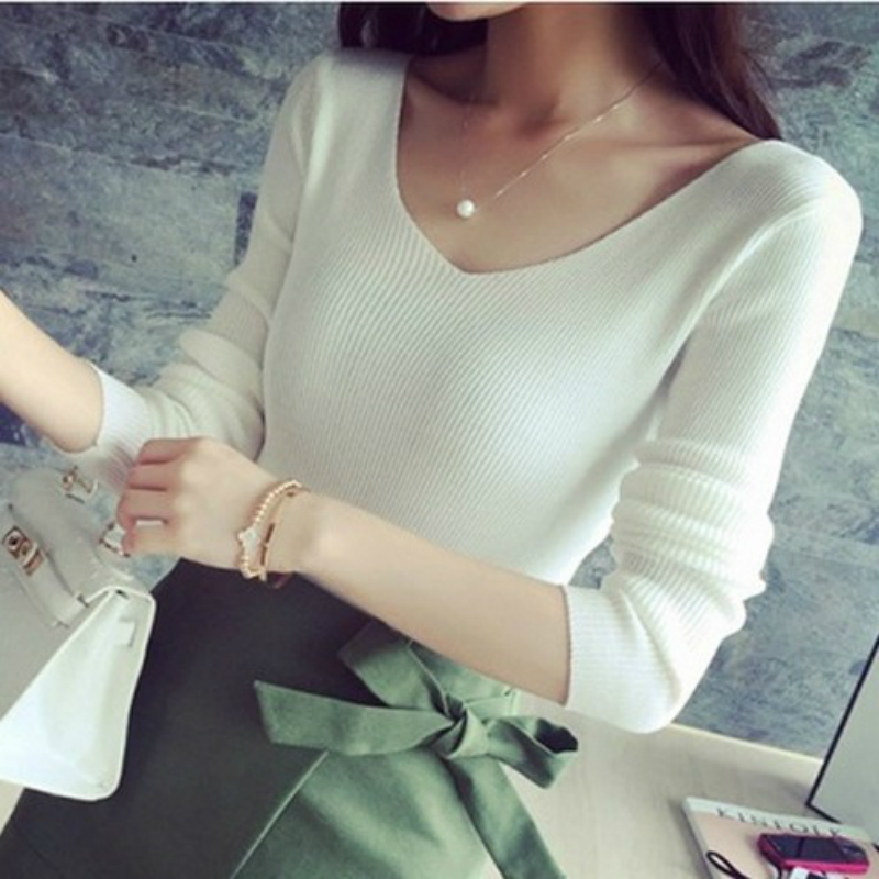 套頭毛衣打底衫秋款女裝韓版V領修身短款白色長袖針織衫女上衣潮