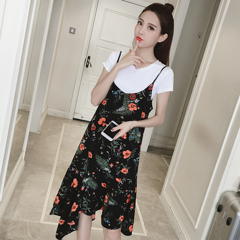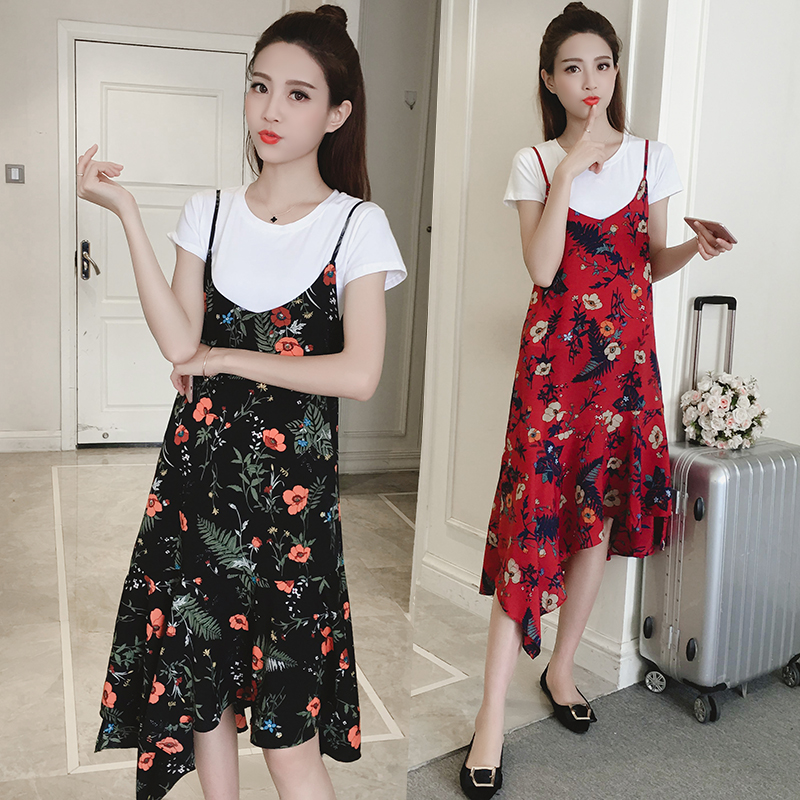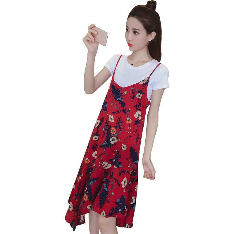 新款女裝復古中長款不規則下擺寬松顯瘦碎花雪紡吊帶連衣裙夏