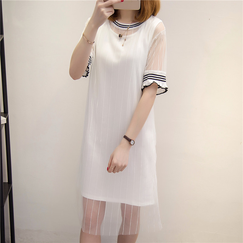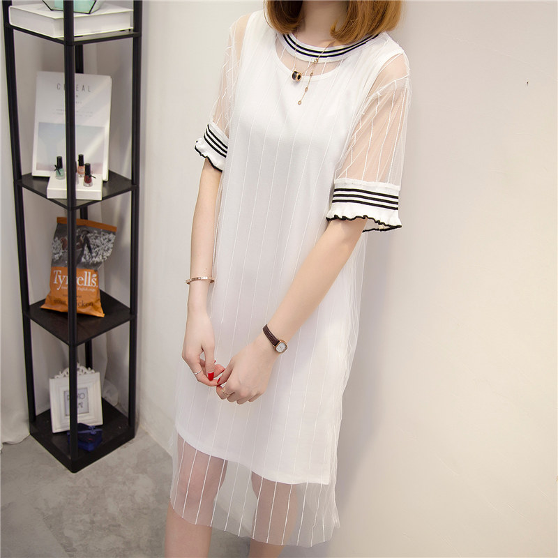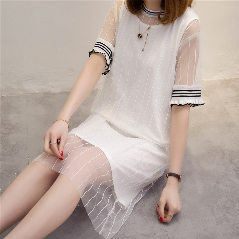 短袖t恤女長款兩件套裝春夏女裝新款潮網紗寬松韓版體恤打底