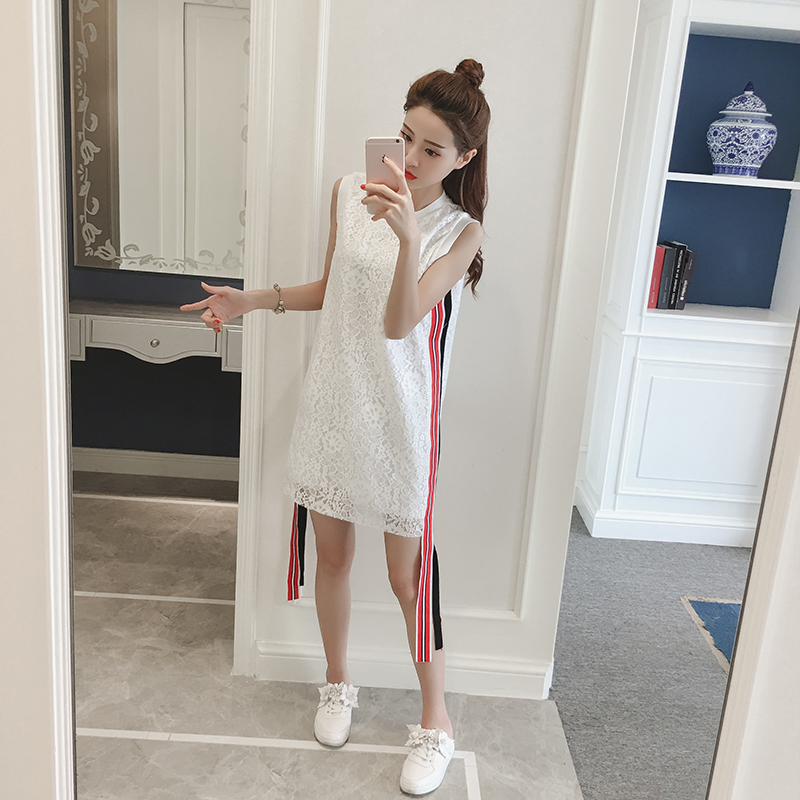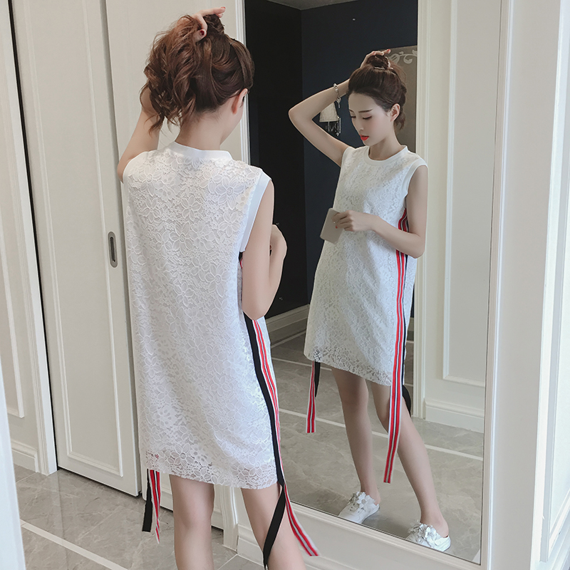 夏季新款女裝韓版時尚織帶裙子中長款顯瘦無袖蕾絲連衣裙女夏