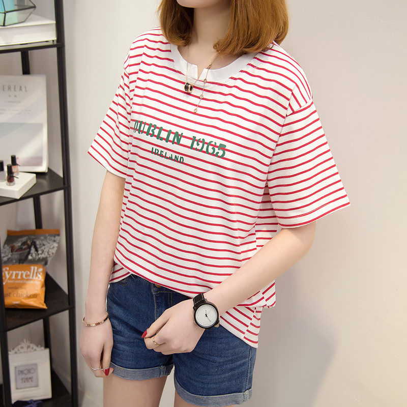 條紋短袖t恤女夏裝新款女裝韓版體恤衫寬松打底休閑上衣女夏