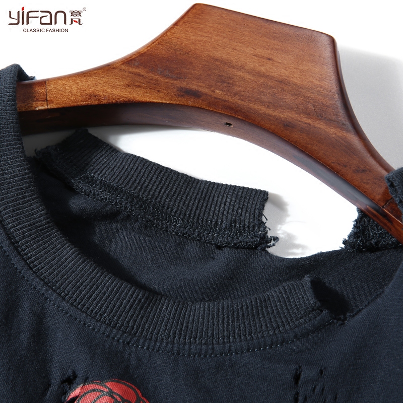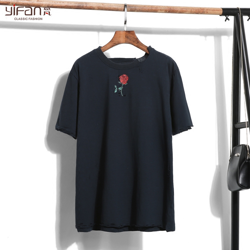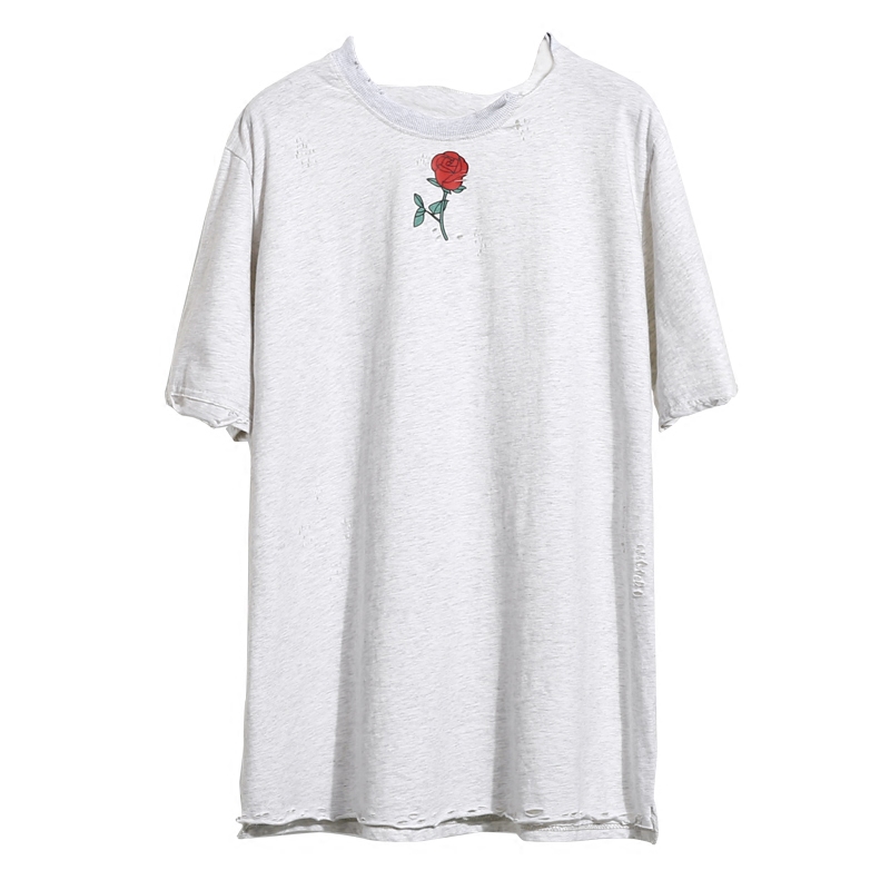 夏季寬松上衣韓國休閑破洞圓領短袖T恤女套頭玫瑰印花做舊
