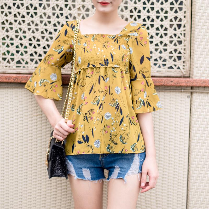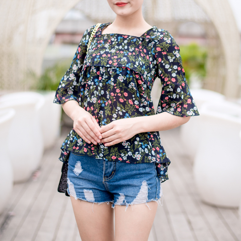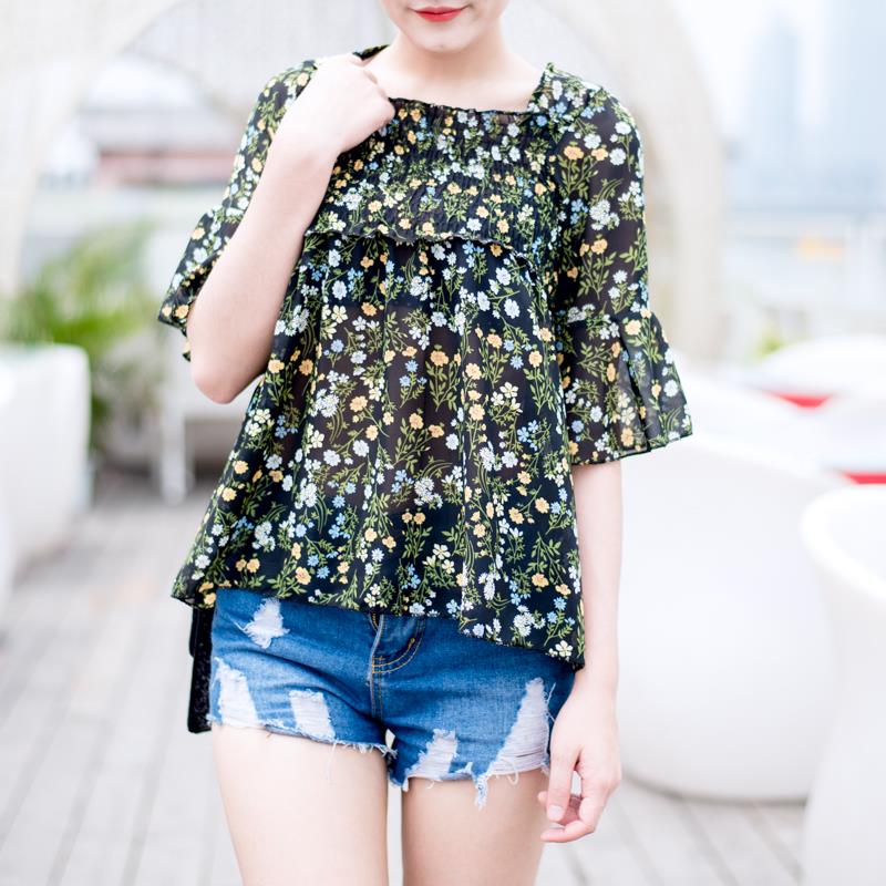 雪紡衫七分袖2017新款大碼女裝寬松喇叭袖打底衫碎花雪紡上衣女夏